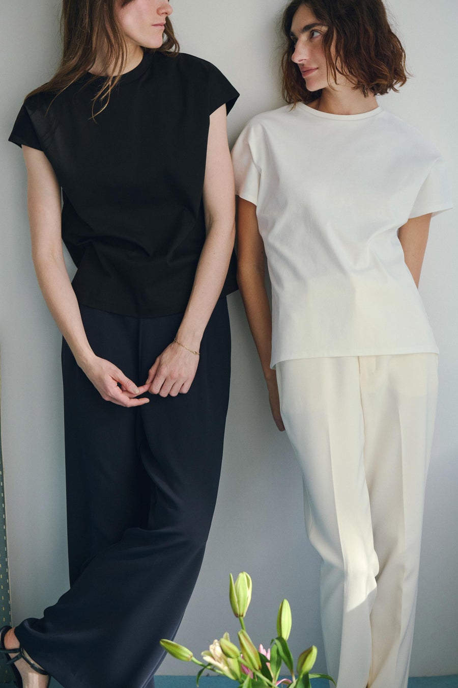 体に張り付きにくい加工を施したコットン生地で、程よい厚みでボディラインが強調されづらく、薄着をした時の心許なさを軽減。ドルマンスリーブと、フレンチスリーブの二型で、それぞれ襟元のデザインが異なるため、お好みのフィット感をお選びいただけます。