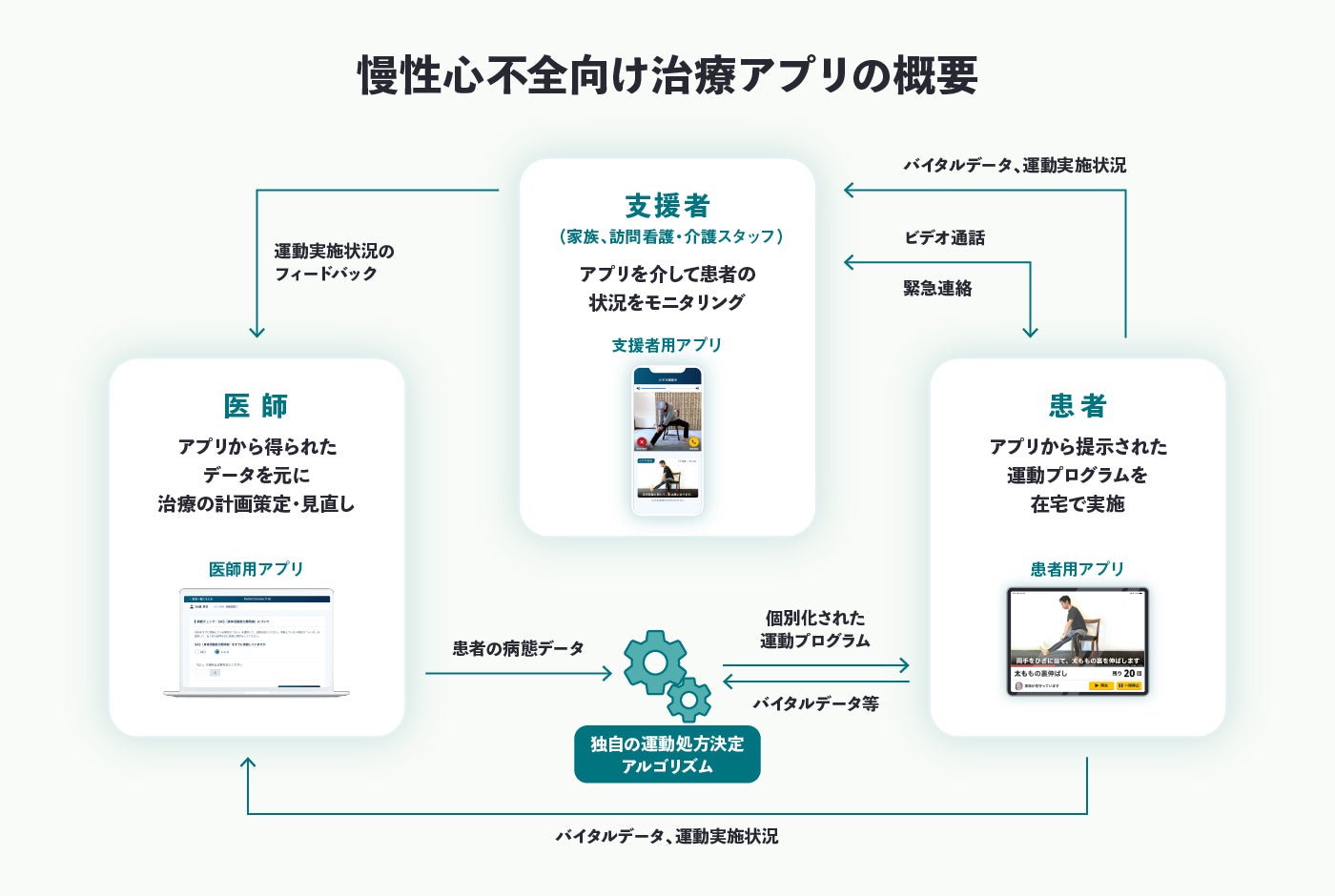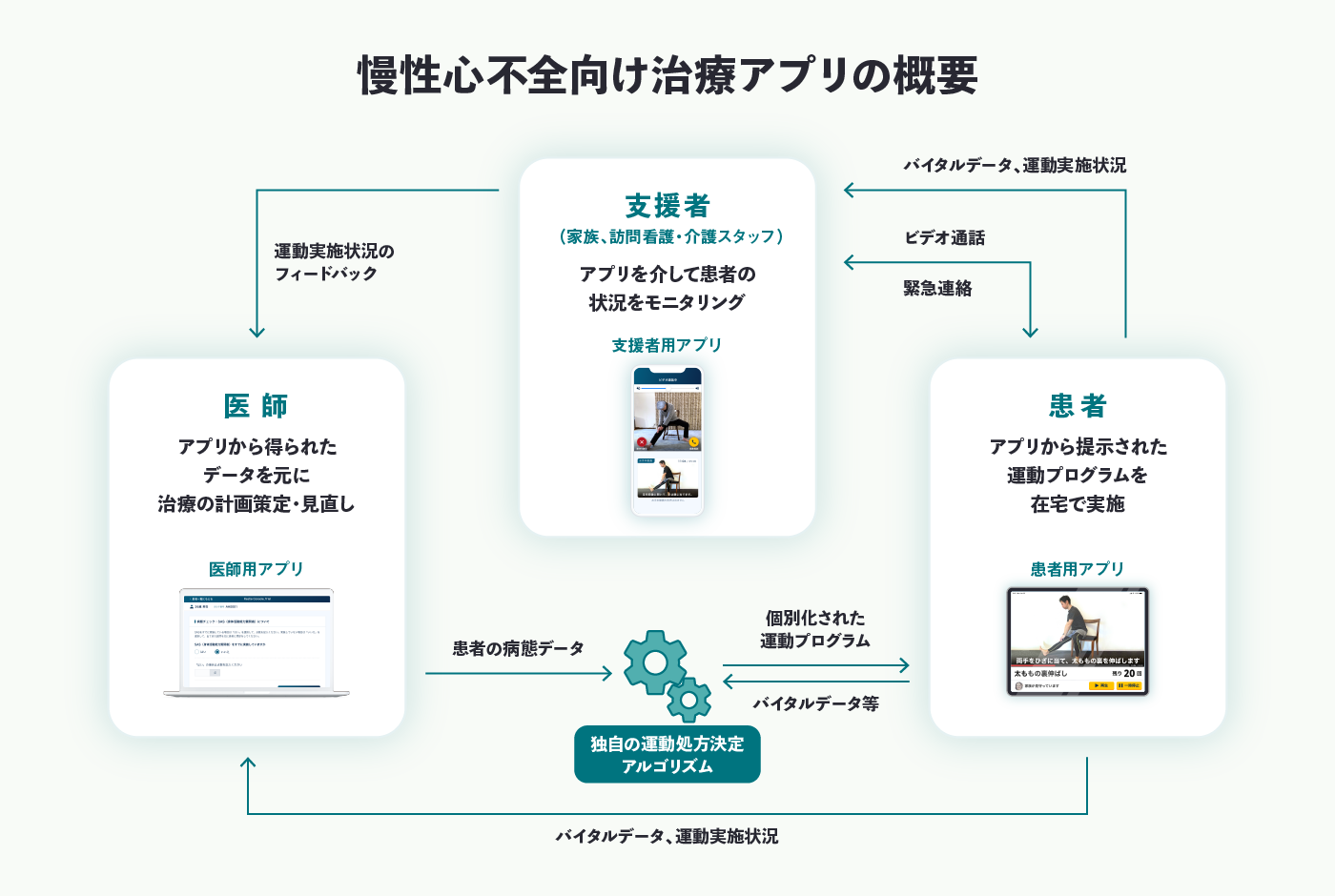慢性心不全治療の課題に対し、自宅にいながら適切な治療介入を受けられる「治療アプリ®︎」というデジタル療法を用いることで、これまで充分な心臓リハビリテーションを受けることが難しかったより多くの慢性心不全患者さんへ心臓リハビリテーションを届けることができると当社は考えています。慢性心不全治療アプリは、患者用アプリ、医師用アプリ、支援者用アプリ(家族や介護・医療系スタッフなど)の3つで構成され、スマートフォンなどを通じ患者さんの個別情報をもとに最適化された運動プログラムや疾病管理をオンラインで提供します。さらに画像解析技術やIoT技術を活用した非監視下での在宅運動モニタリングシステムを搭載し、患者さんに安心して在宅運動療法に取り組んでいただけるご自宅での包括的心臓リハビリテーションを実現し、患者さんの予後改善を目指してまいります。