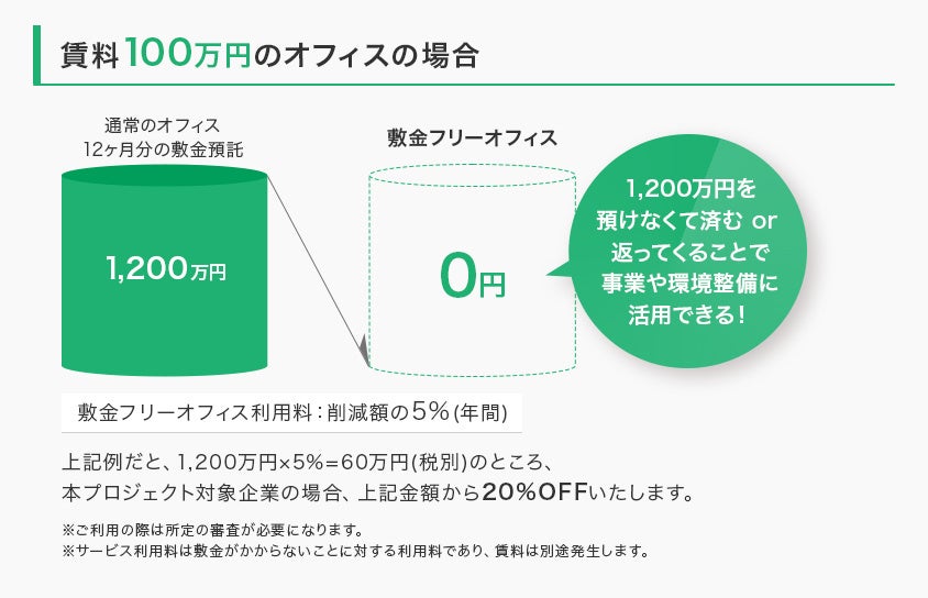 2023年7月31日までにお問い合わせいただいた企業限定で、新規入居や移転、さらには現在入居しているオフィスで既に支払っている敷金を戻してもらうといった2つの敷金の減額サービスの利用料を20%OFFにいたします。