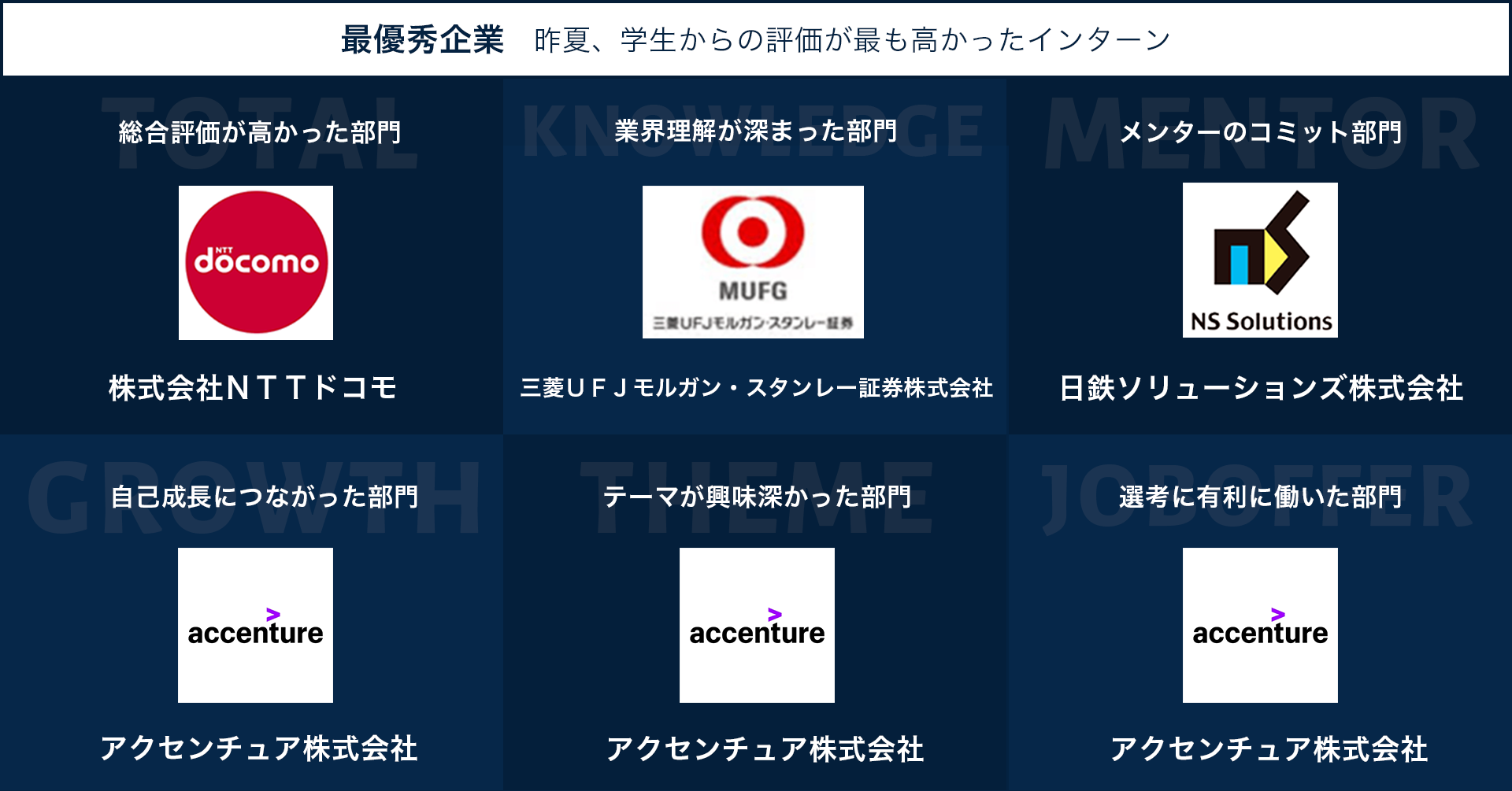 学生がインターンシップに参加する際に特に重視する「総合評価」「業界理解」「メンターのコミット」「自己成長」「テーマの面白さ」「内定直結度」の6項目において評点を集計し、上位5企業を選出しています。