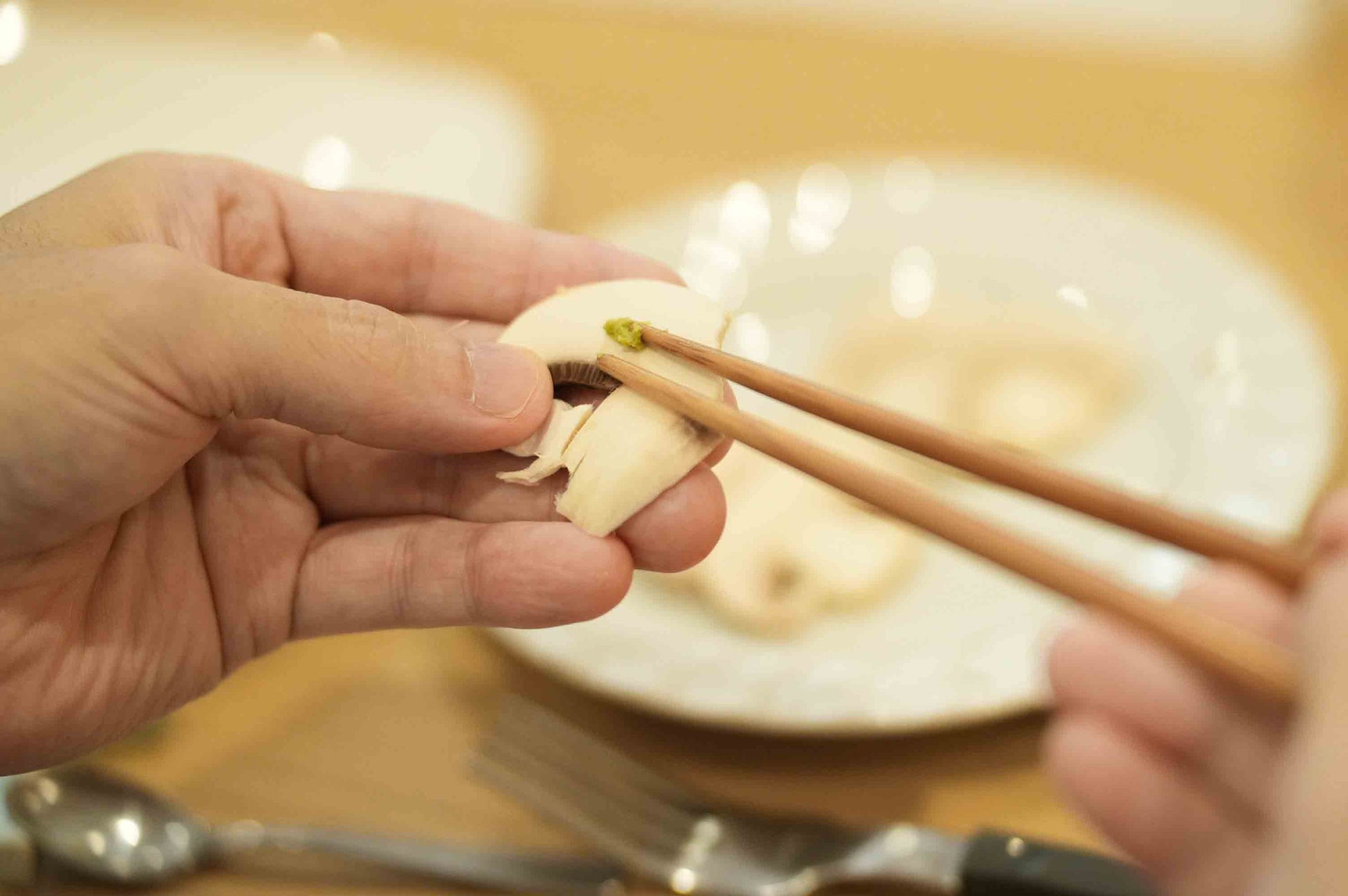 ・塩麴昆布締めのマッシュルーム、大葉、わさびを合わせる