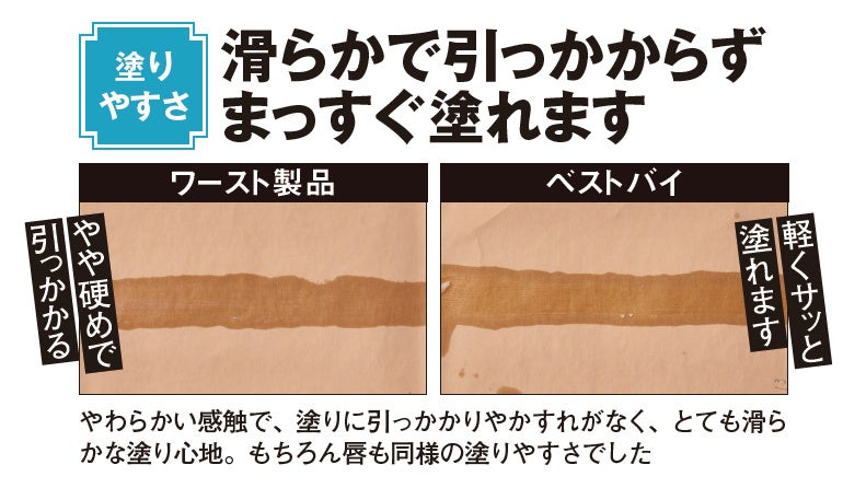 リップクリームをあぶらとり紙に同条件で塗り、滑らかさや塗りやすさを評価しました。