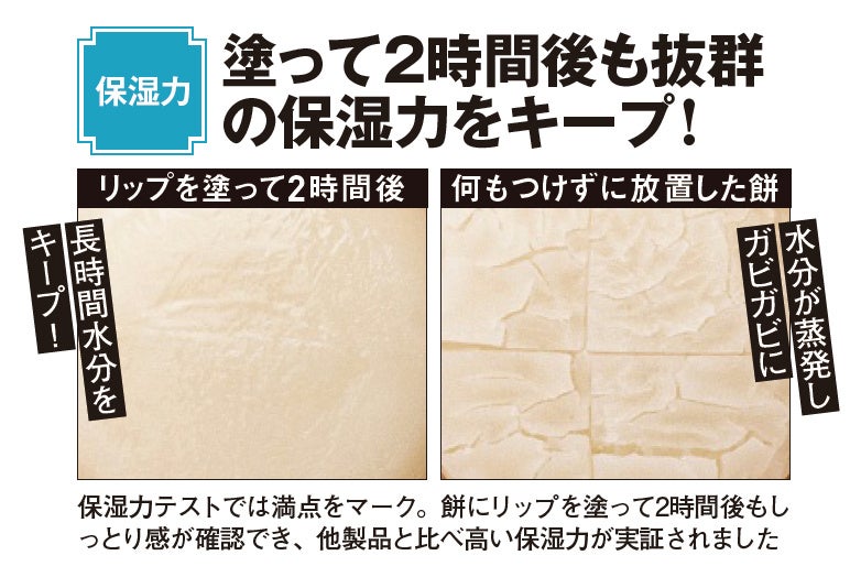 肌に見立てた丸餅にリップクリームを均等に塗り、水分の蒸発をどれだけ抑えられるかを専用機器で計測。
