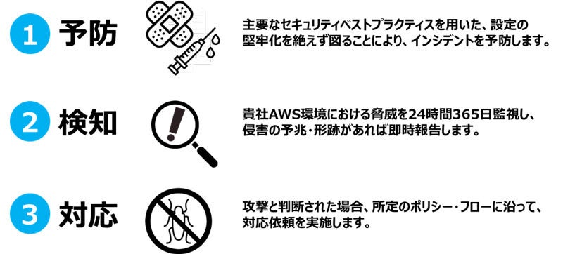 本サービスはAWS環境におけるシステムに対し、インシデントの予防・脅威の検知・攻撃対応の3つのフェーズでセキュリティ対策のご支援をします。