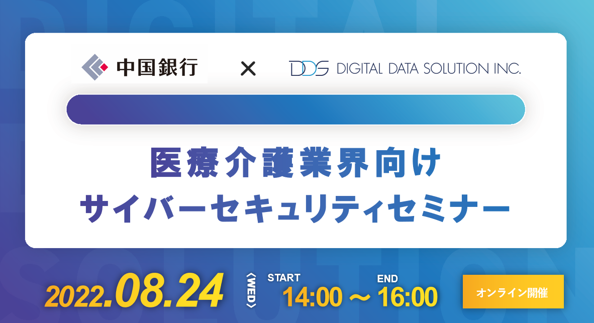 デジタルデータソリューション株式会社(本社:東京都港区、代表取締役社長:熊谷 聖司、以下弊社)は、2022年8月24日、中国銀行主催のサイバーセキュリティセミナーにて、「医療介護業界における情報セキュリティの現状と対策」について講演を行いました。