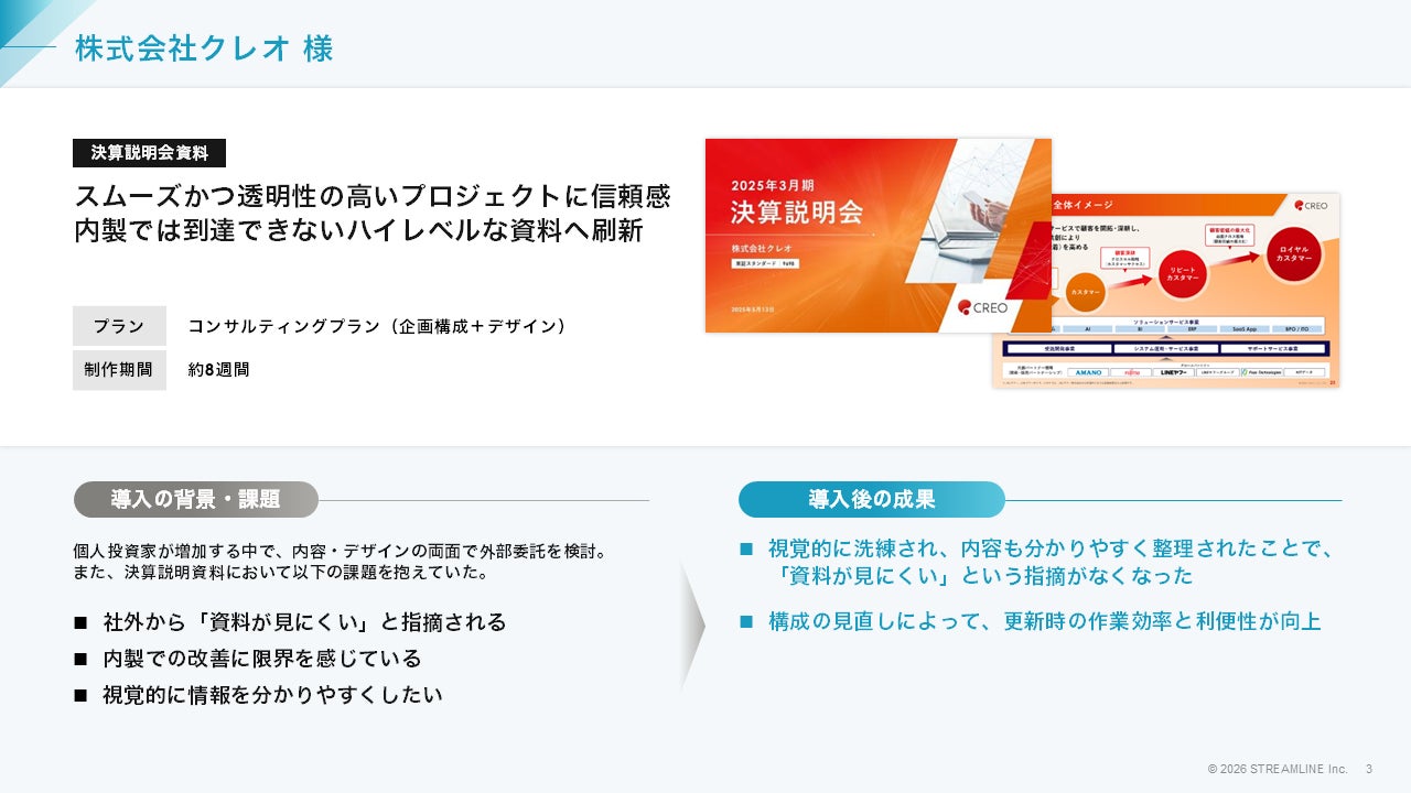 株式会社ストリームライン(所在地:東京都品川区 代表者:梶山洋二)は、提供するIR資料作成支援サービス「LEAD」の導入事例集を大幅に刷新し、無料公開いたしました。
