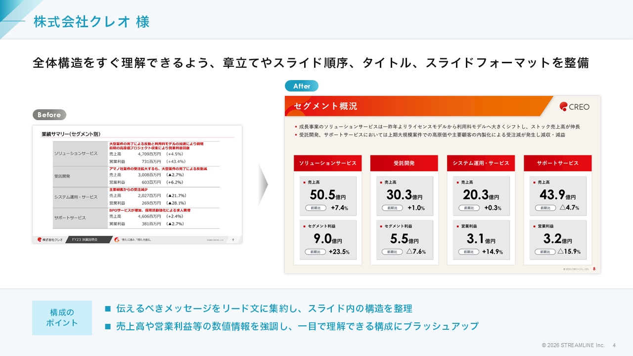 全体構造を把握しやすくするためのスライド統合やリード文の改善、重要数値を強調するテクニックや成長戦略の図解化まで、スライド構成時のポイントを具体的に解説しています。