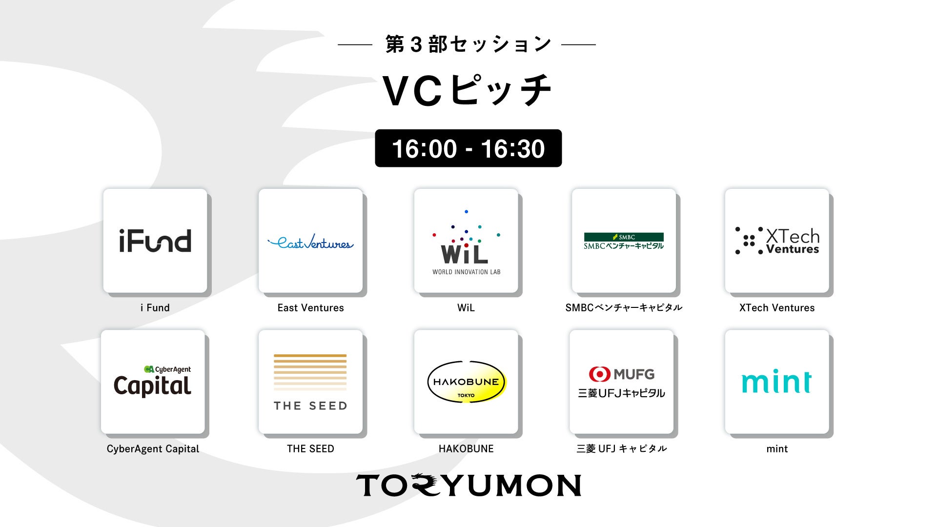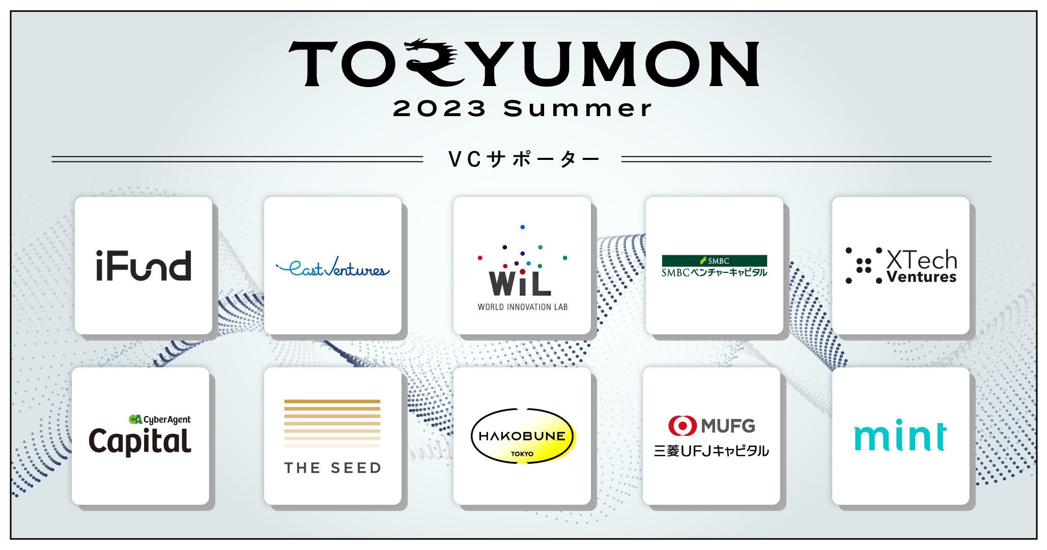 今回初の試みとしてVCサポーターという枠組みを設定しました。学生/U25世代が、ご活躍中の投資家の方々と今まで以上に密なコミュニケーションを取る機会を創出することで、スタートアップへの流入を促進し、エコシステムの発展を目指していきます。今回、TORYUMONの趣旨に共感いただいた10社のVCの皆様の協力により、本取り組みが実現いたしました。