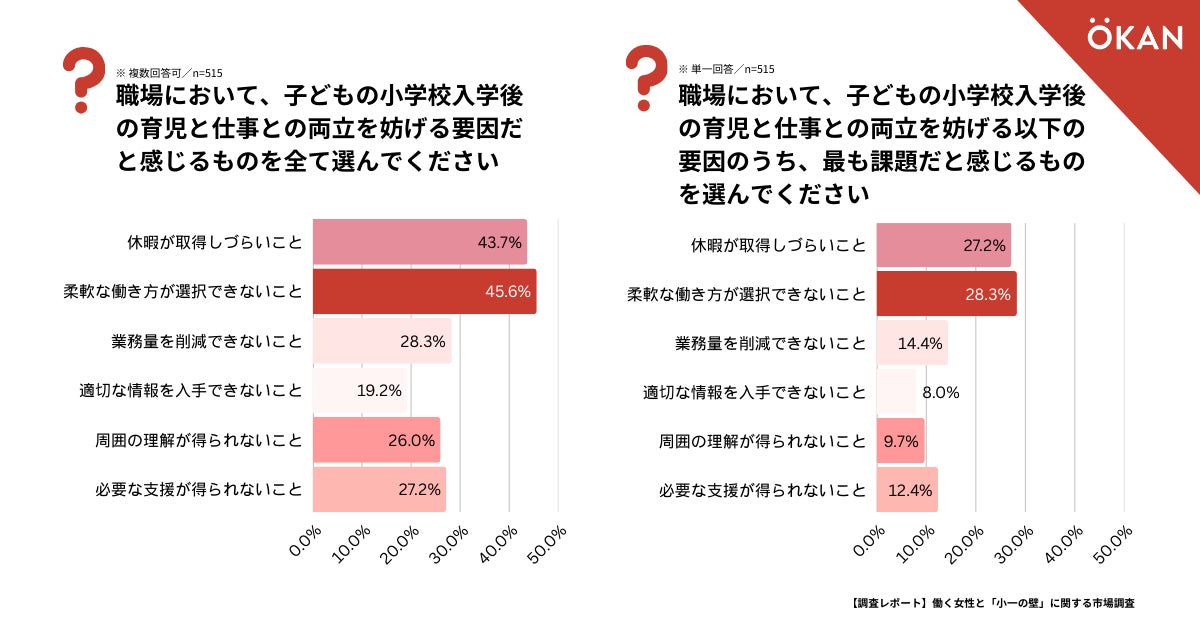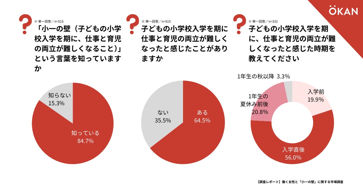 「望まない離職」を生まない組織づくりを支援する株式会社OKAN(本社:東京都豊島区、代表取締役:沢⽊恵太、以下OKAN)は、小学校低学年の子どもを持つ働く女性515名を対象に、「小一の壁」に関する調査を行いました。