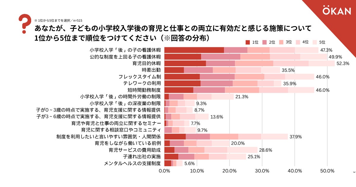 あなたが、子どもの小学校入学後の育児と仕事との両立に有効だと感じる施策について、1位から5位まで順位をつけてください [1位から5位までを選択/n=515]