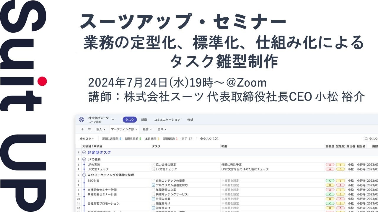 株式会社スーツ(所在地:東京都千代田区、代表取締役社長CEO:小松 裕介)は、2024年7月24日(水)19時から、当社代表の小松が講師を務めるスーツアップ・セミナー「業務の定型化、標準化、仕組み化によるタスク雛型制作」を無料開催します。