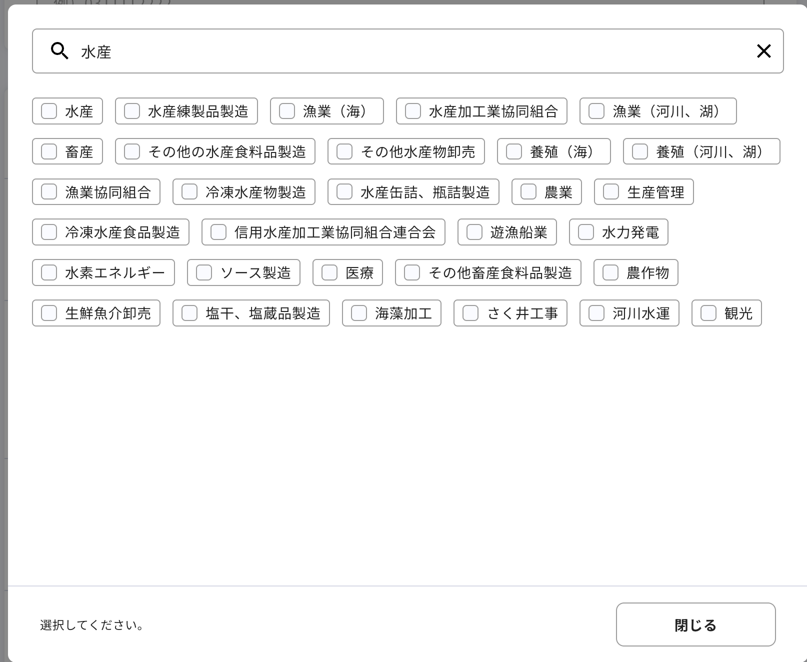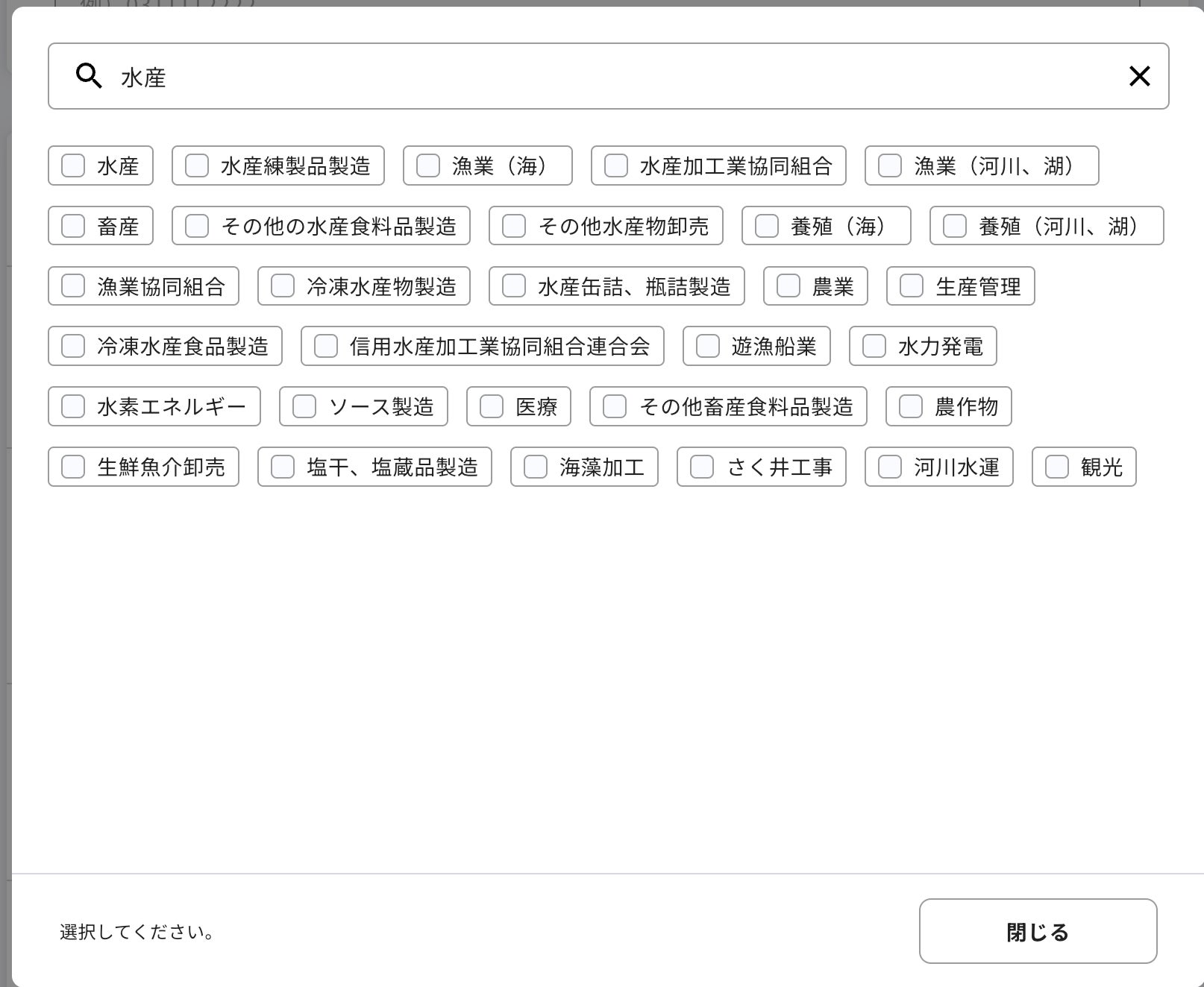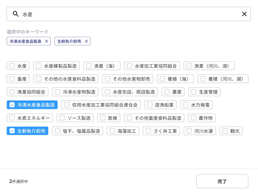 今回開発した新機能は、「水産」「農業」といった抽象的なキーワードを入力することで、関連する1,000件以上のキーワードが自動で選択肢として抽出されます。これにより、より詳細なニーズの把握が可能となるだけではなく、忙しい経営者や担当者の方の手間を削減することができます。