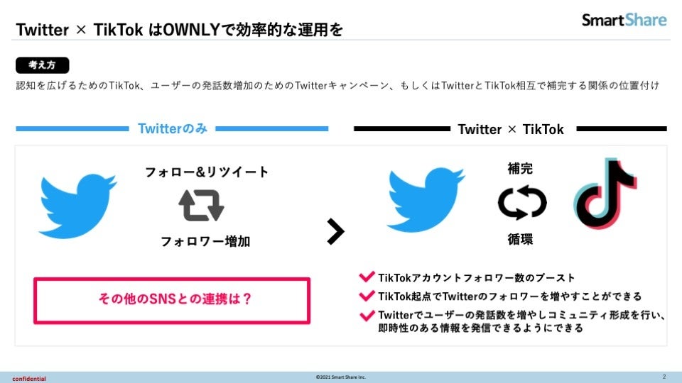 SNSマーケティングプラットフォームOWNLY(オウンリー)を開発・運営するスマートシェア株式会社(東京都渋谷区、代表取締役 西山統 以下「当社」)は、OWNLYとTikTok広告やTikTokやTwitterキャンペーンと連携できるプロモーションパッケージ「TikTok × Twitter by OWNLY」の提供を開始いたしました。