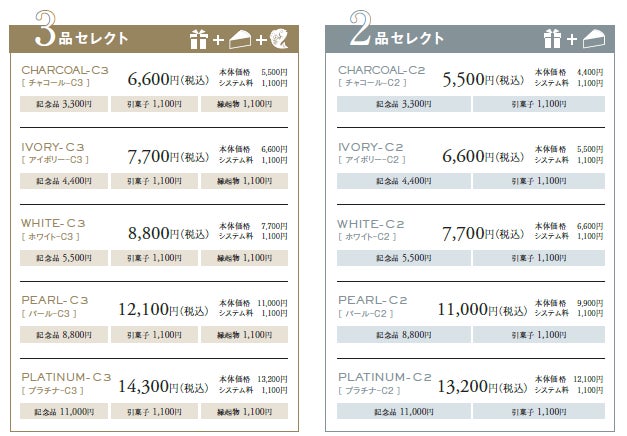 ・2品セレクトは5,500円~13,200円(税込み)、[記念品]と[引菓子]
