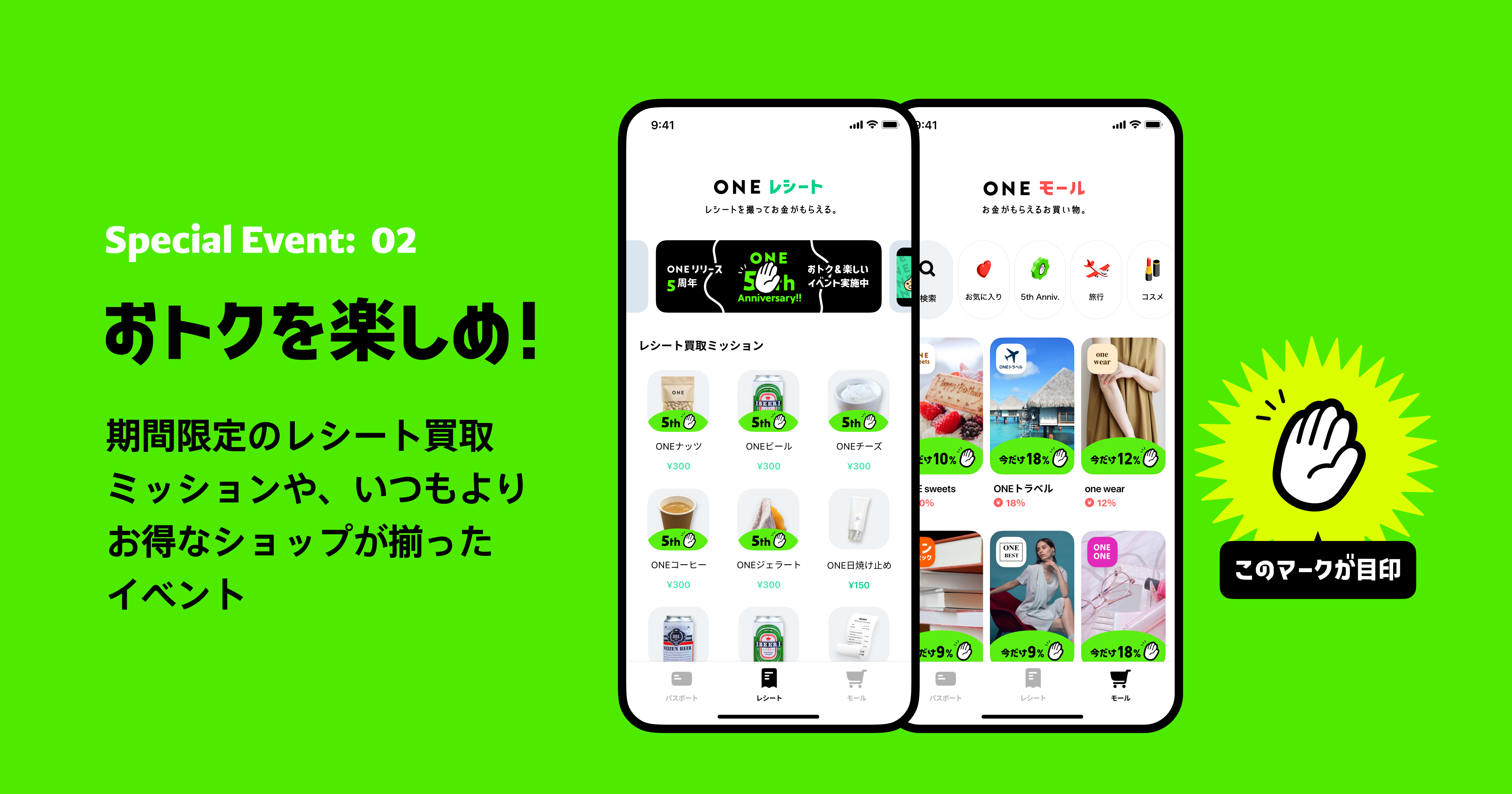 お金がもらえるお買い物アプリ「ONE」5周年!~お得なイベント開催決定~