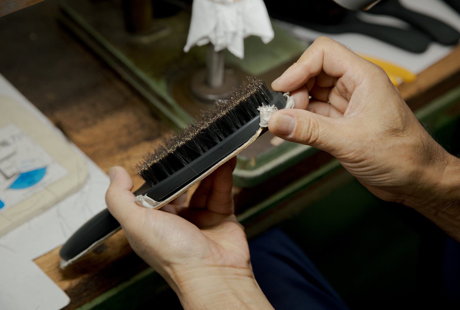 広い空間に表現されたうねりの形状と石を避ける曲線、その合間に見える直線の流れから髪の流れを想起しました。広い空間から毛束を入れ、その後に整然と揃った空間を通して出す。ここから独自の植毛パターンのアイデアが浮かびました。このようにして枯山水から着想を得た「ケアストレートブラシ」が誕生しました。