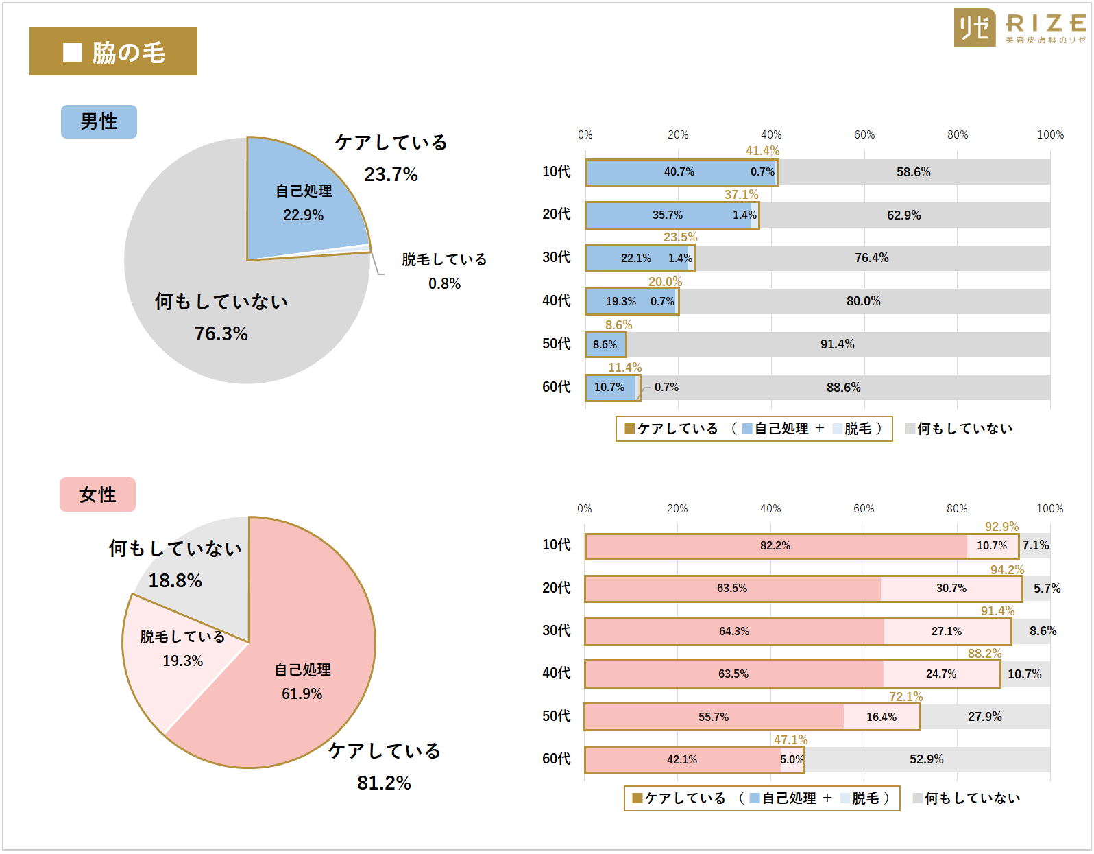 - ⑤【ワキ毛】男性:50代以上はケア率10%前後も、20代3割、10代4割以上は「ケアする」