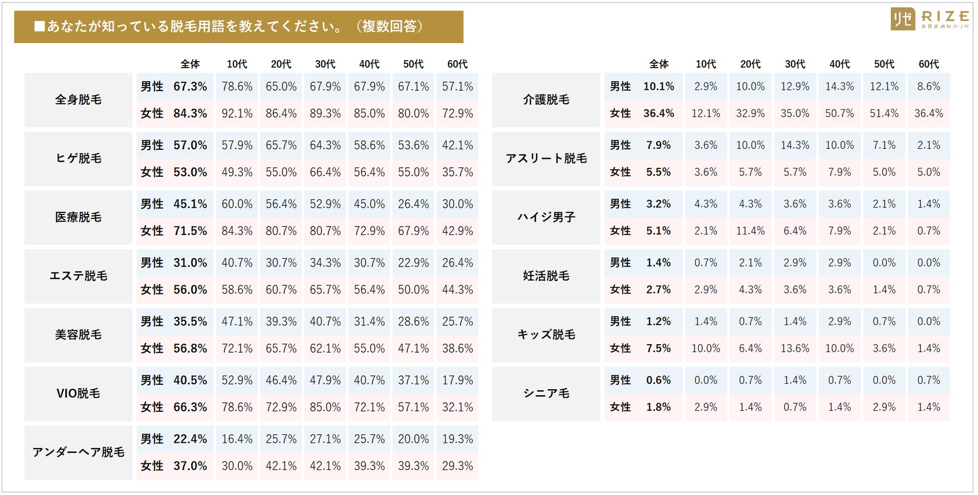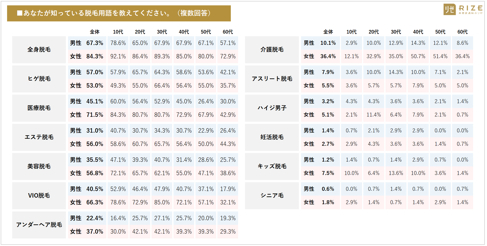 - ⑨ 【脱毛用語の認知】男女共に「全身脱毛」がトップ、次いで男性「ヒゲ脱毛」女性は「医療脱毛」