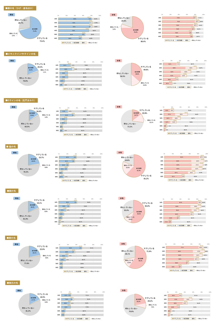 性別・世代別による「体毛ケアしている各ボディパーツ(部位)」のランキング発表とあわせ、各部位別の体毛に対する意識の違いやその理由、また各種・脱毛用語の認知度ほか、【多様性の時代における「体毛観」、その現在地】を徹底調査しました。