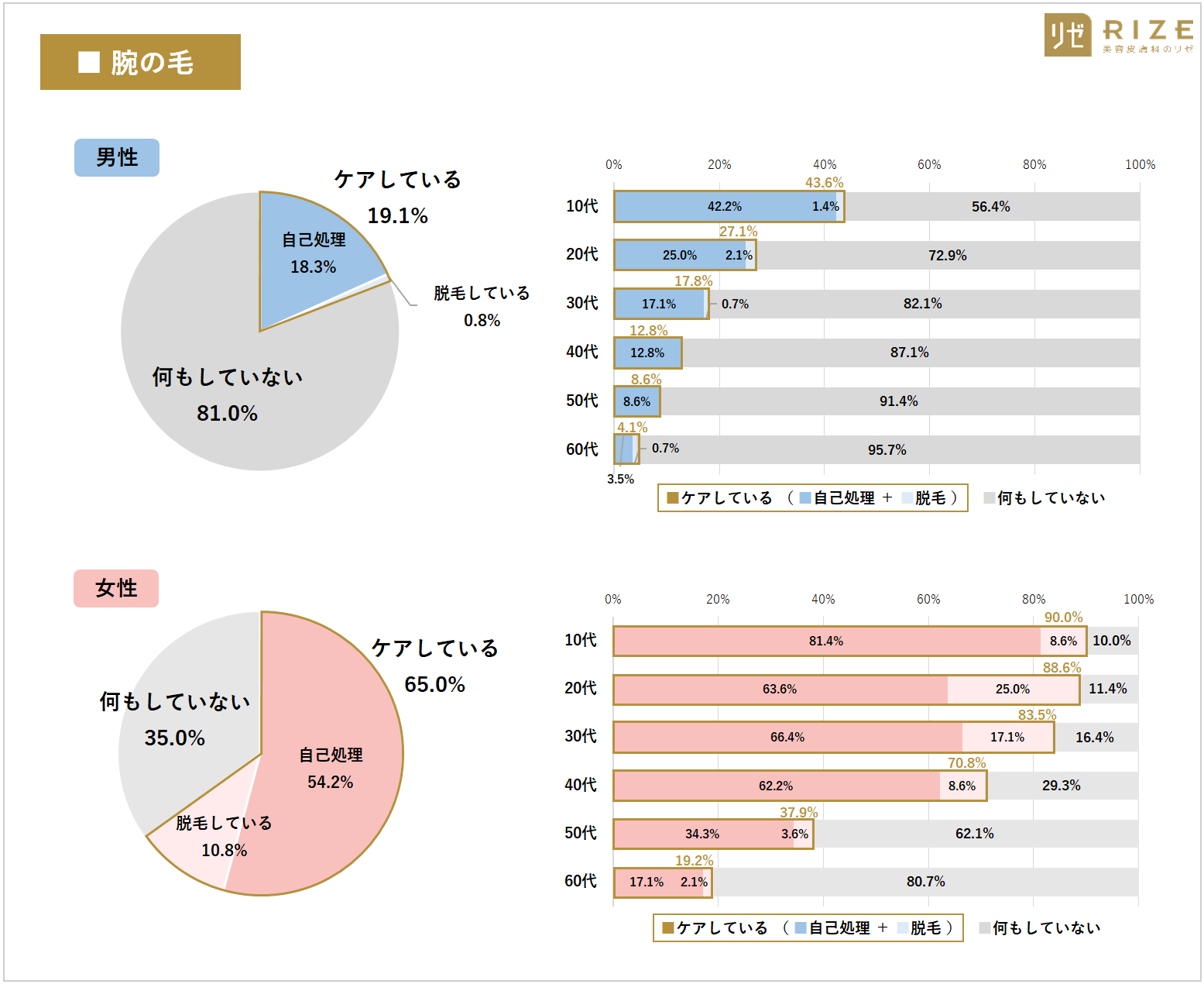 → 男女ともに腕毛のケア率は10代が最多(男性:43.6%・女性:90.0%)