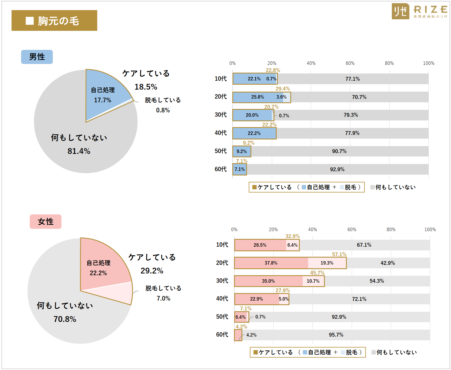 - ⑧【胸元の毛(胸毛)】男性は2割(18.5%)、女性の3割(29.2%)が「ケアをしている」