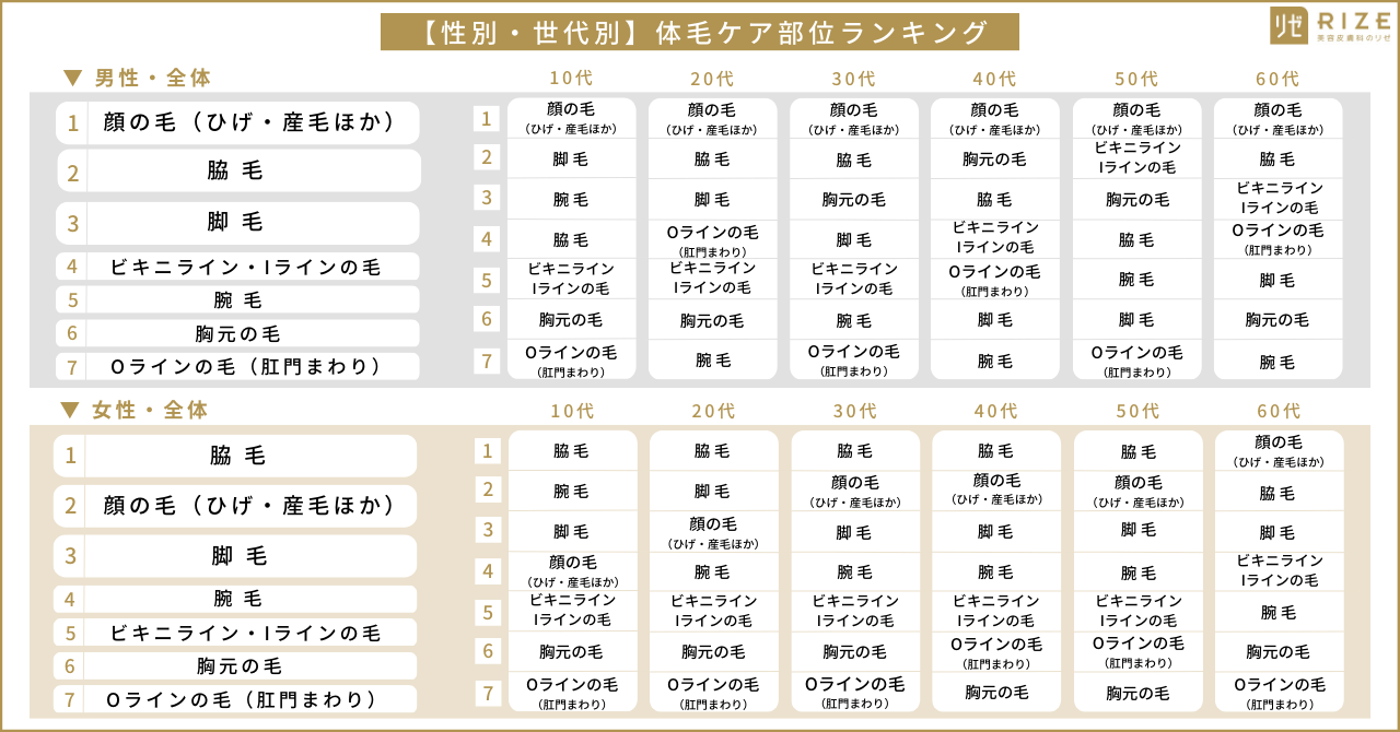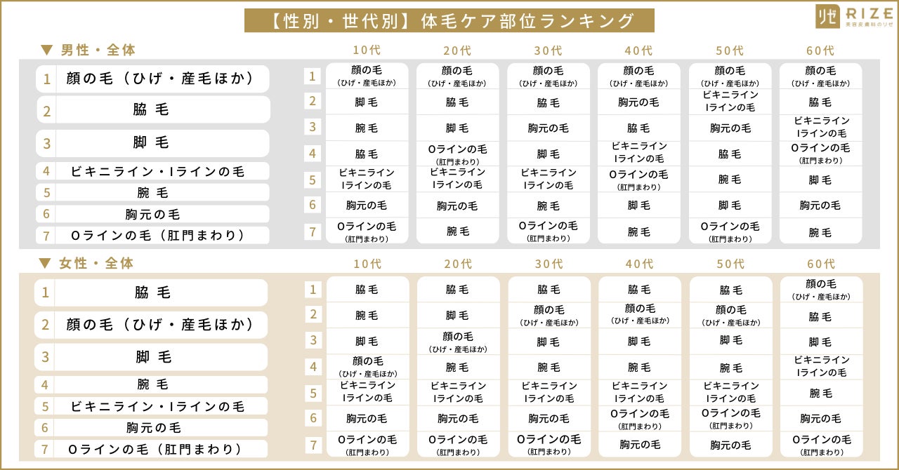 - ①【性別・世代別】「日ごろ体毛ケアしているボディパーツ(部位)ランキング」トップ3発表