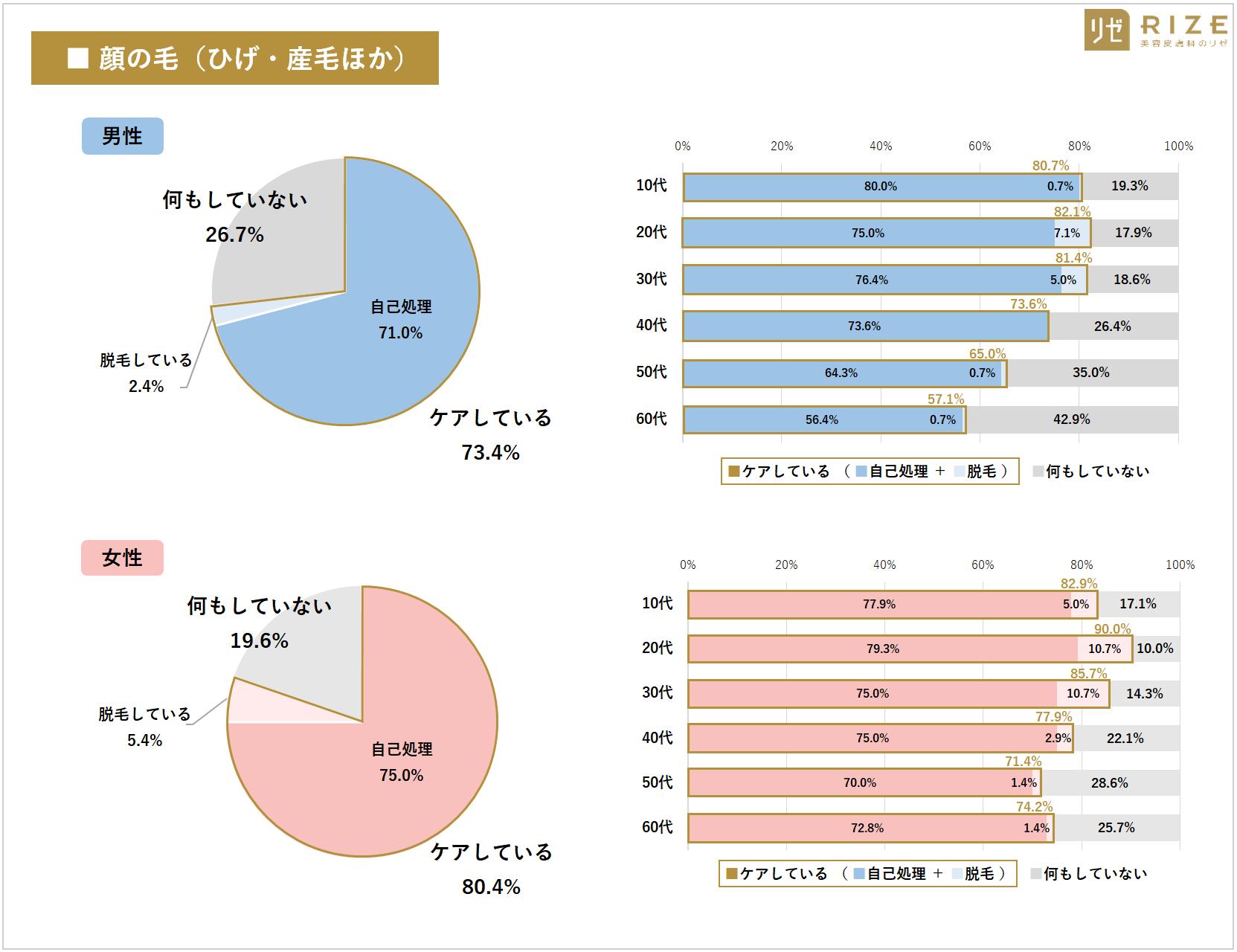 ②【顔の毛(ヒゲを含む)】 男性7割以上、女性8割が「ケアをしている」