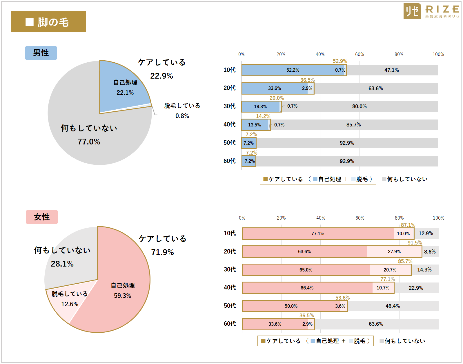 ⑦【脚毛】昨今、人気のショートパンツ効果?男性の20代は4割、10代は5割以上がケア