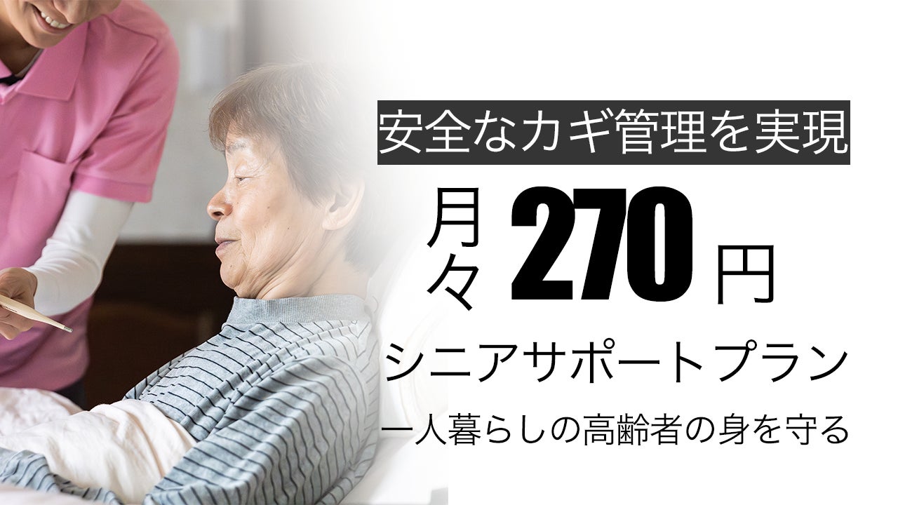 【ご好評につき、こちらのプランは終了いたしました】 月々270円の介護事業者向けプラン「シニアサポートプラン」が登場! 一人暮らしの高齢者の家のカギをキーボックスよりも安全に管理できます