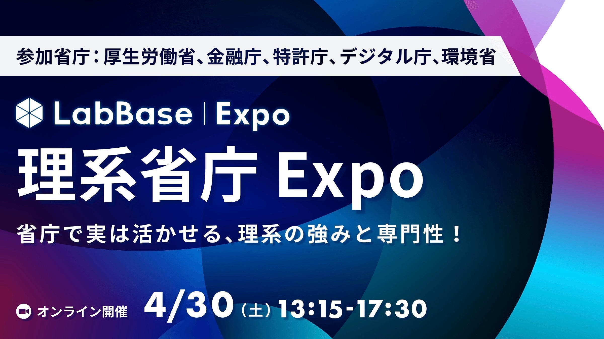 研究内容をもとに優秀な理系学生をスカウトできる新卒採用サービス「LabBase(ラボベース)」を運営している株式会社POL(本社:東京都千代田区、代表取締役CEO:加茂倫明)は、4月30日(土)複数の省庁と理系学生向けの採用イベント「理系省庁 Expo」を開催いたします。本イベントは、理系の強みと専門性が各省庁でどのように活きるのかを学生に認知していただくことを目的として開催いたします。