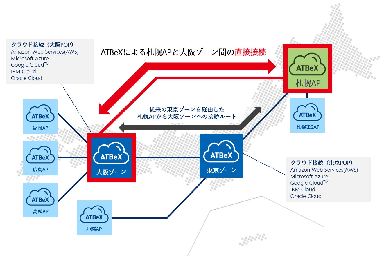 これまで、ATBeX札幌APから大阪ゾーンに接続する際にはATBeX東京ゾーンを経由する必要がありましたが、本サービスの開始により直接接続が可能となります。