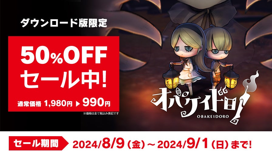 2024年8月9日(金) 0:00 ~9月1日(日) 23:59までの期間、ダウンロード版『オバケイドロ!』が50%OFFとなる期間限定セールを実施します。