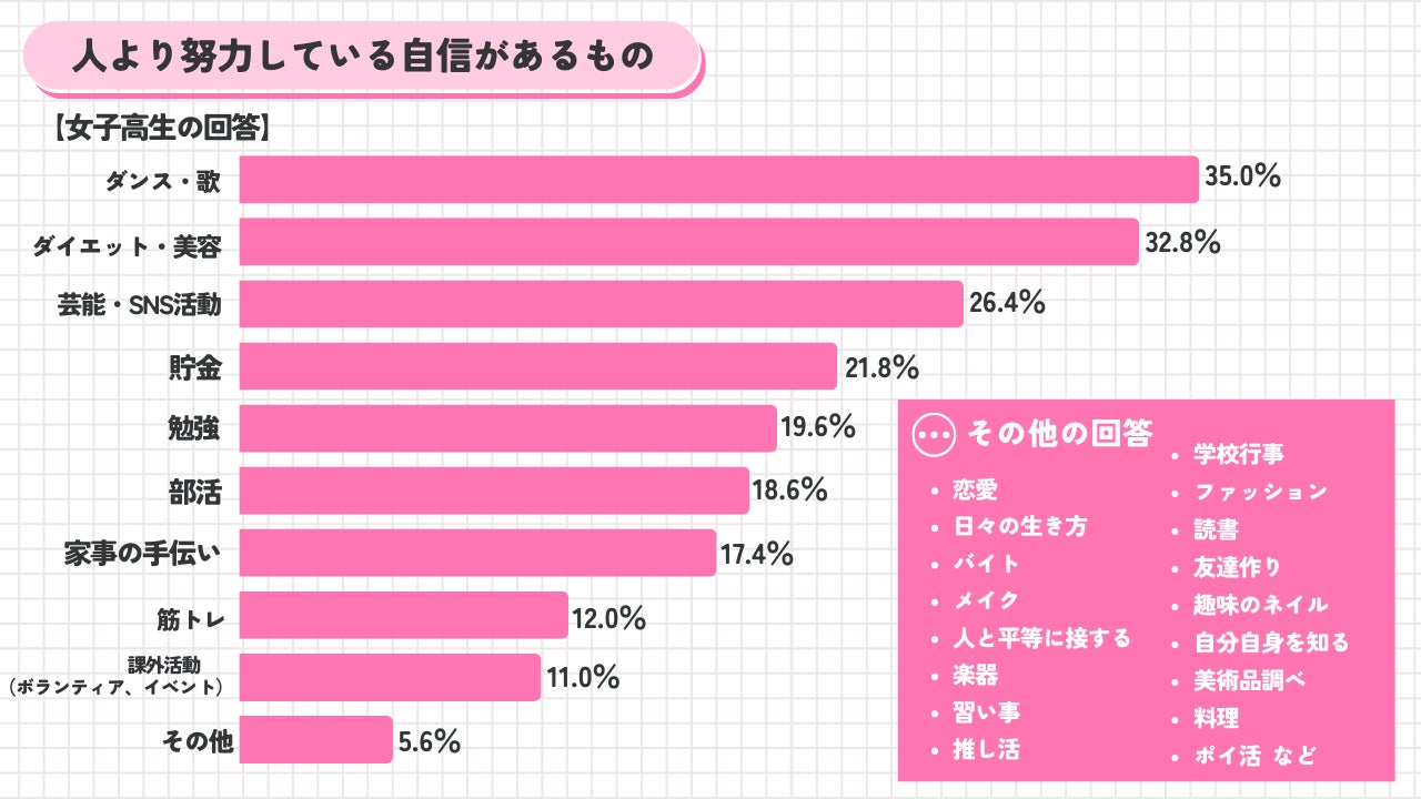 女子は「芸能活動」「美容」、男子は「筋トレ」「学校生活」で努力している傾向が強いことが分かる調査結果となりました。