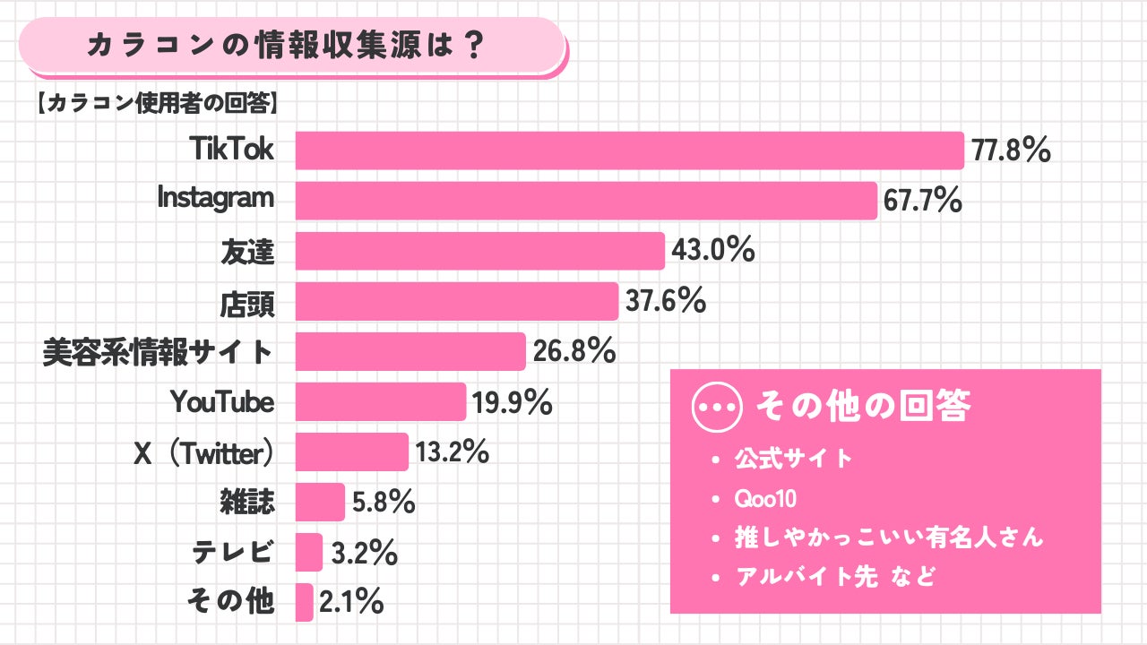 アンケート調査を行った結果、TikTokやInstagramなどのSNSからカラコンについて情報収集を行う高校生が多く、それぞれの基準で好みのカラコンを選んで使い分けていることが分かりました。