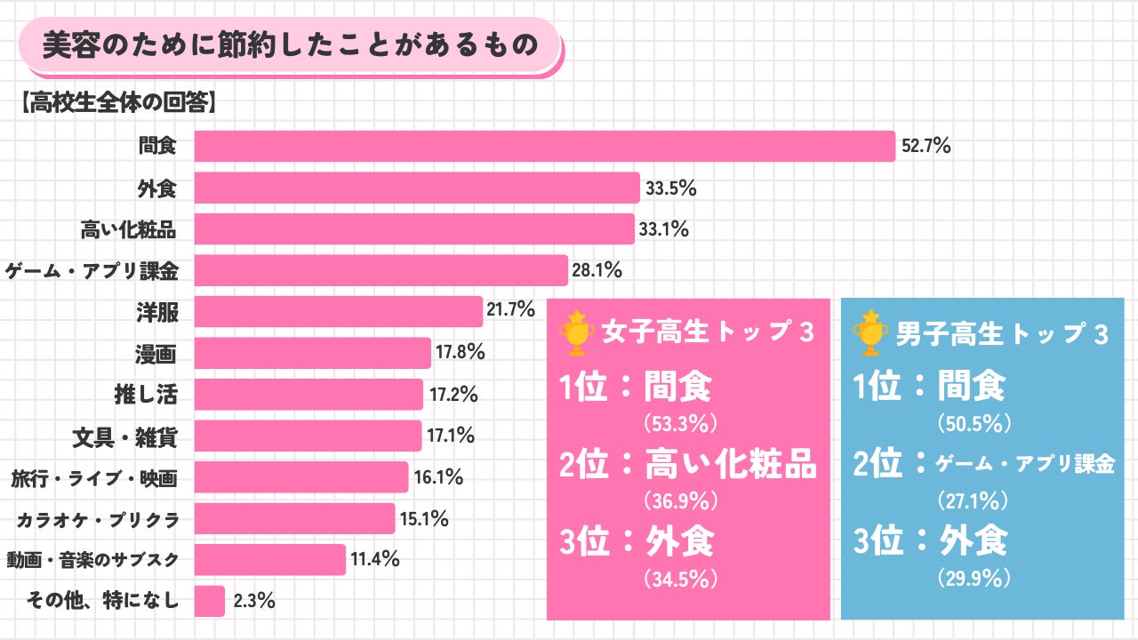 男女どちらも回答数が最も多かったのは「間食」でしたが、女子の第2位は「高い化粧品(36.9%)」、男子の第2位は「ゲーム・アプリ課金(27.1%)」と男女差が出る結果になりました。美容を気にして何かを節約する場合、男子も女子も普段お金を使う機会が多いものを控える傾向にあるのかもしれません。