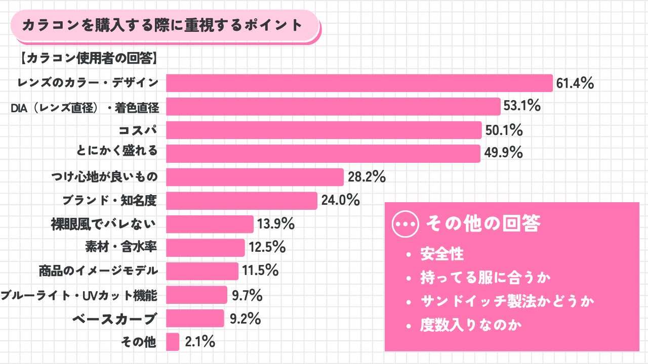 その一方で「つけ心地がいいもの(28.2%)」、「素材・含水率(12.5%)」、「ブルーライト・UVカット機能(9.7%)」など、コンタクトレンズとしての機能面を重視する声は比較的少ないという結果に。ビジュアルを重視してカラコンを選ぶ高校生が多いと言えます。