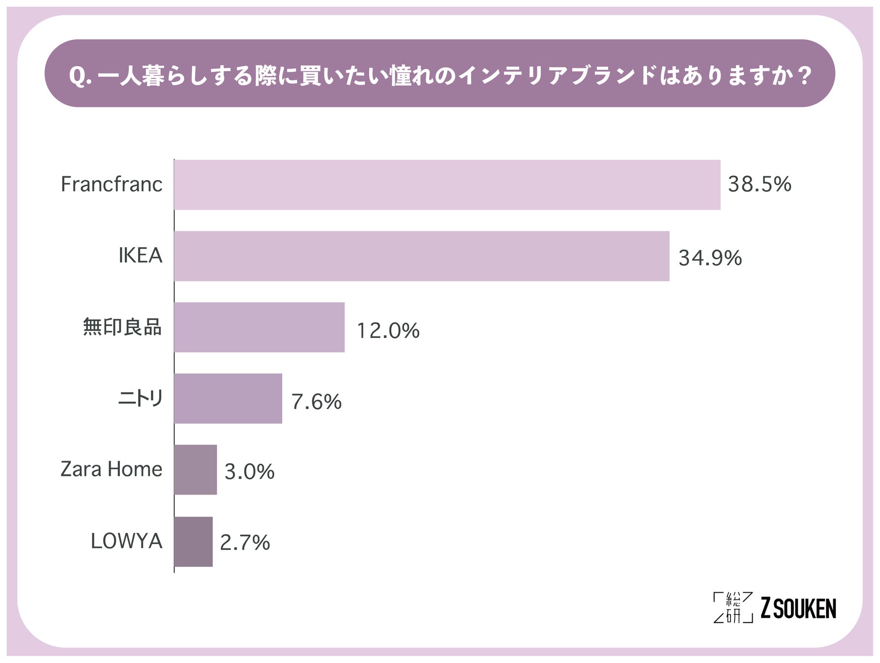 アンケートにて「 一人暮らしする際に買いたい憧れのインテリアブランドはありますか?」と尋ねたところ、ガーリーなアイテムが豊富な『Francfranc(38.5%)』が最も多く、次いで、『IKEA(34.9%)』、『無印良品(12.0%)』との結果になりました。