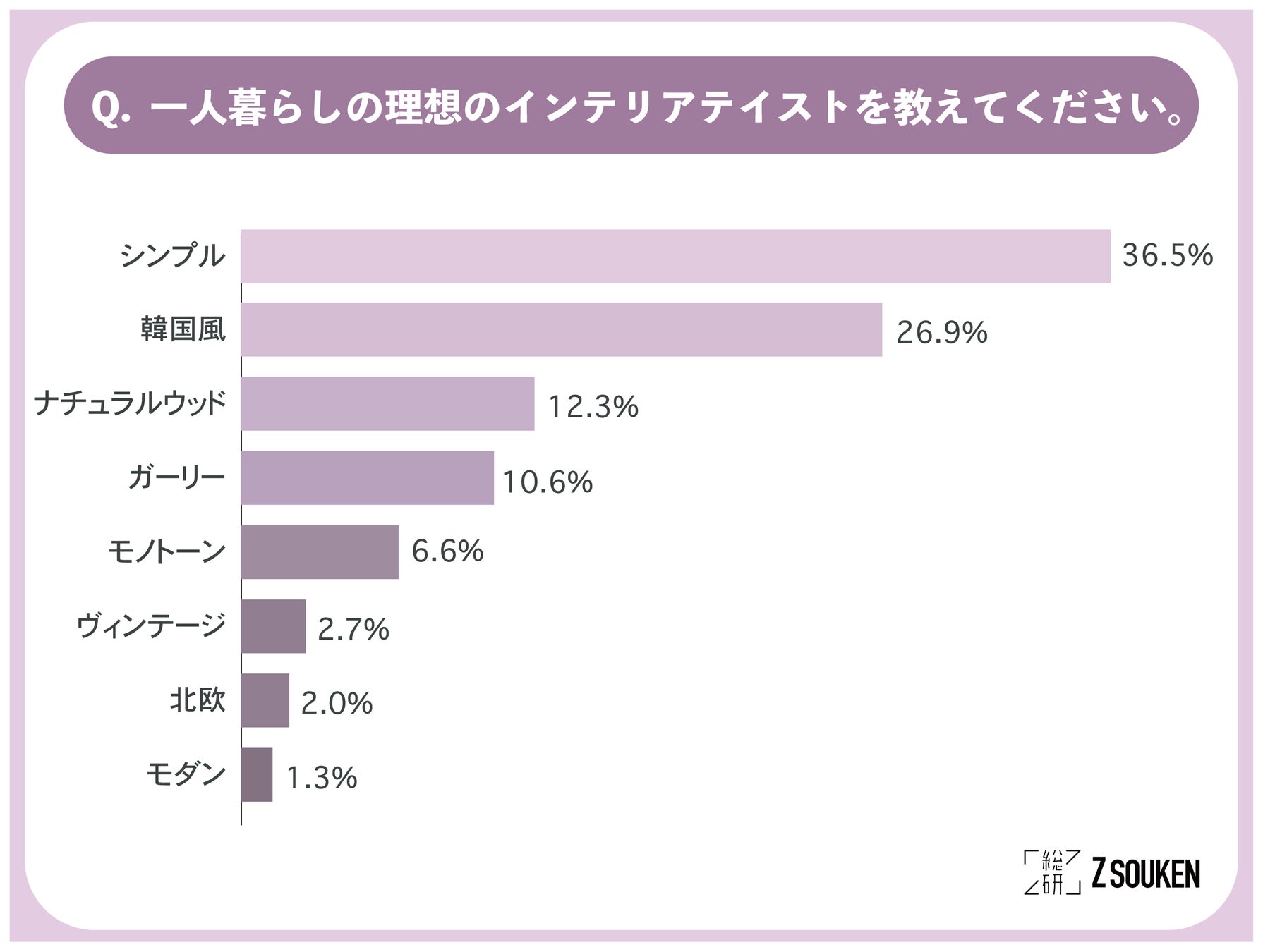アンケートにて「一人暮らしの理想のインテリアテイストを教えてください。」と尋ねたところ、『シンプル(36.7%)』が最も多く、次いで『韓国風(26.9%)』が多い結果となりました。