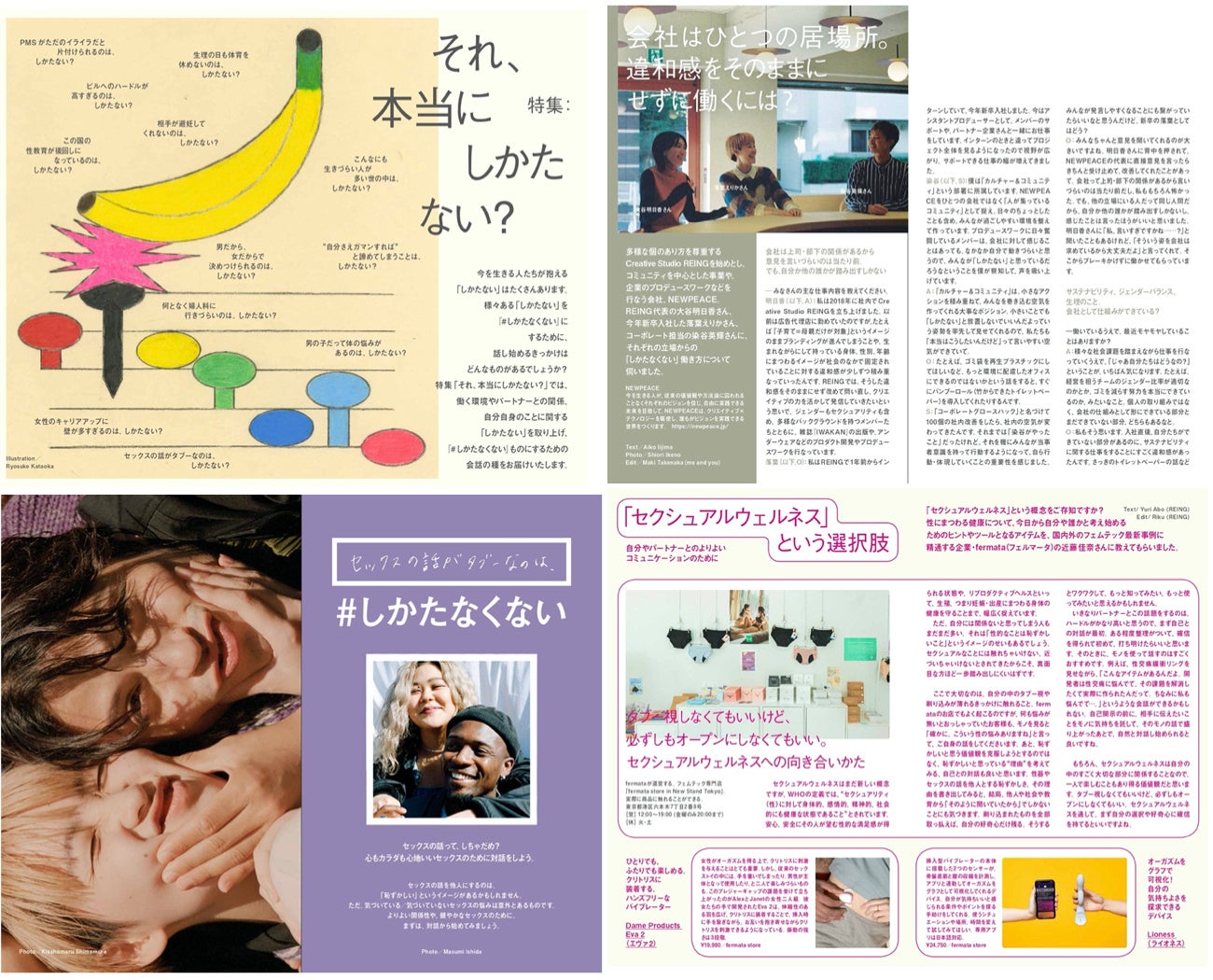 創刊号では、自分のことだから「しかたない」と我慢しがちなテーマについて取り上げています。生理、セックス、避妊に関する意識調査をはじめ、働きやすい職場環境づくりや性教育、避妊について、さまざまな立場の人へインタビューを行っています。