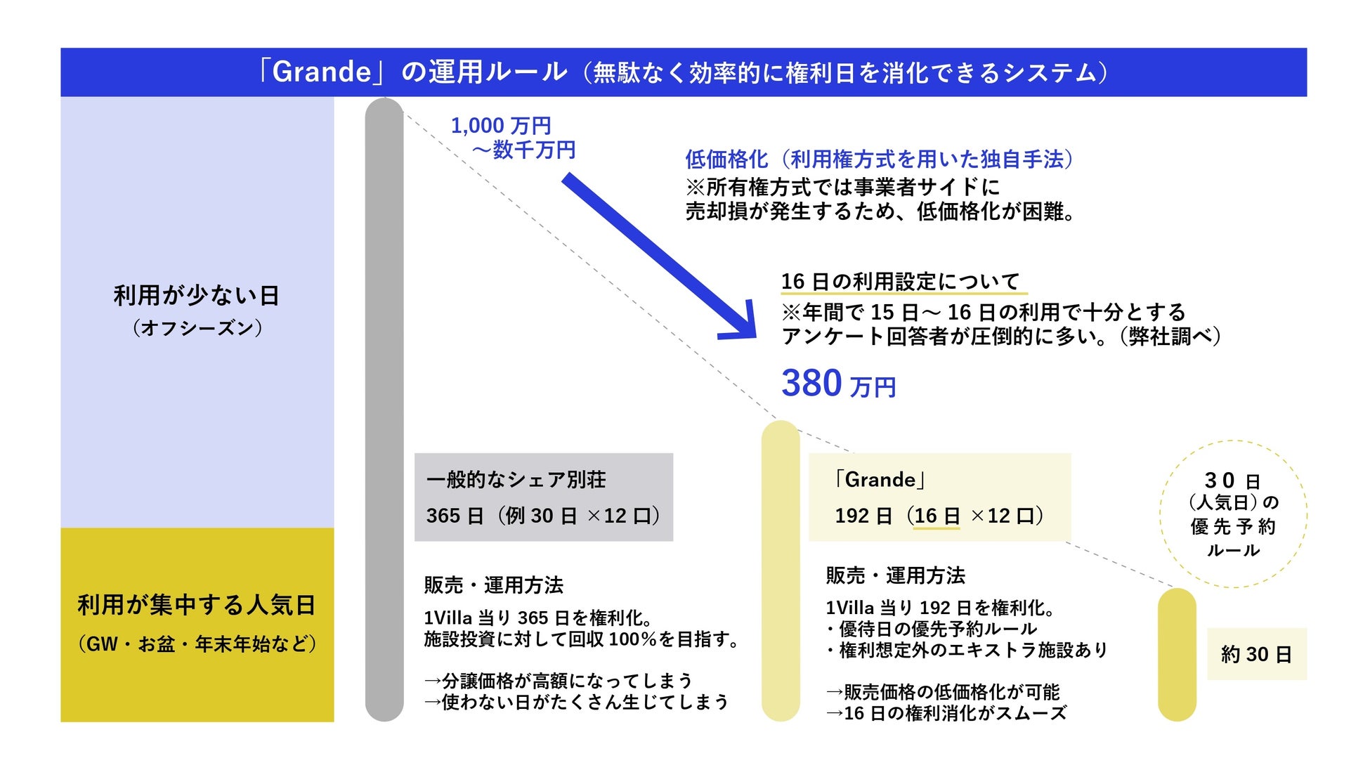 対して、Grandeでは“利用権方式”を採用していますので、会員権販売時にVillaの初期投資全額を回収する必要がなく、会員権を低額化することができます。