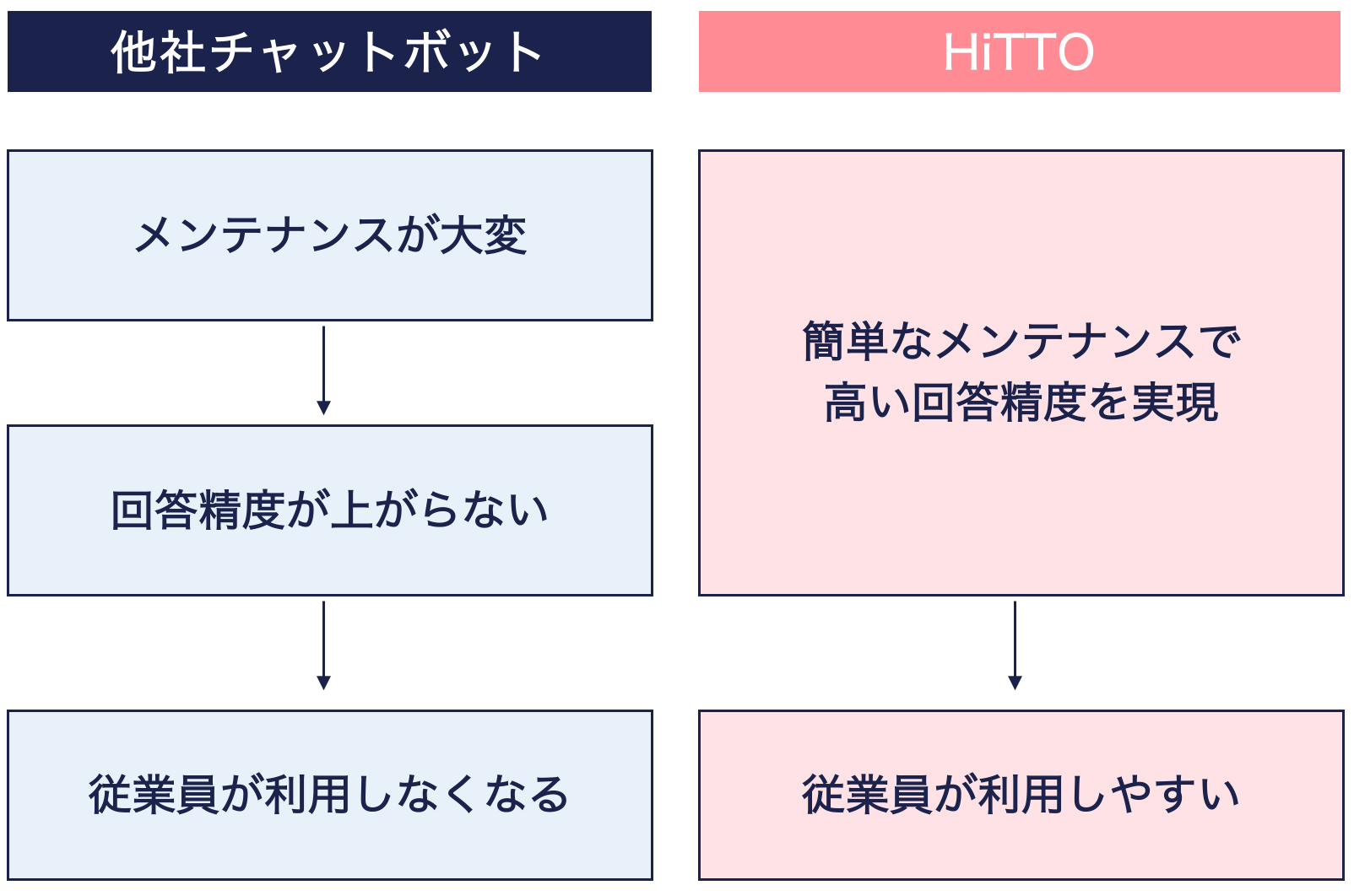 切り替えの検討にあたり、複数のチャットボットを比較検討した中で、HiTTOを採用しました。以前に導入していたチャットボットは、データの修正や確認に膨大な時間がかかってしまうためメンテナンスのサイクルを構築することができず、結果として、回答精度が上がらずに活用できておりませんでした。