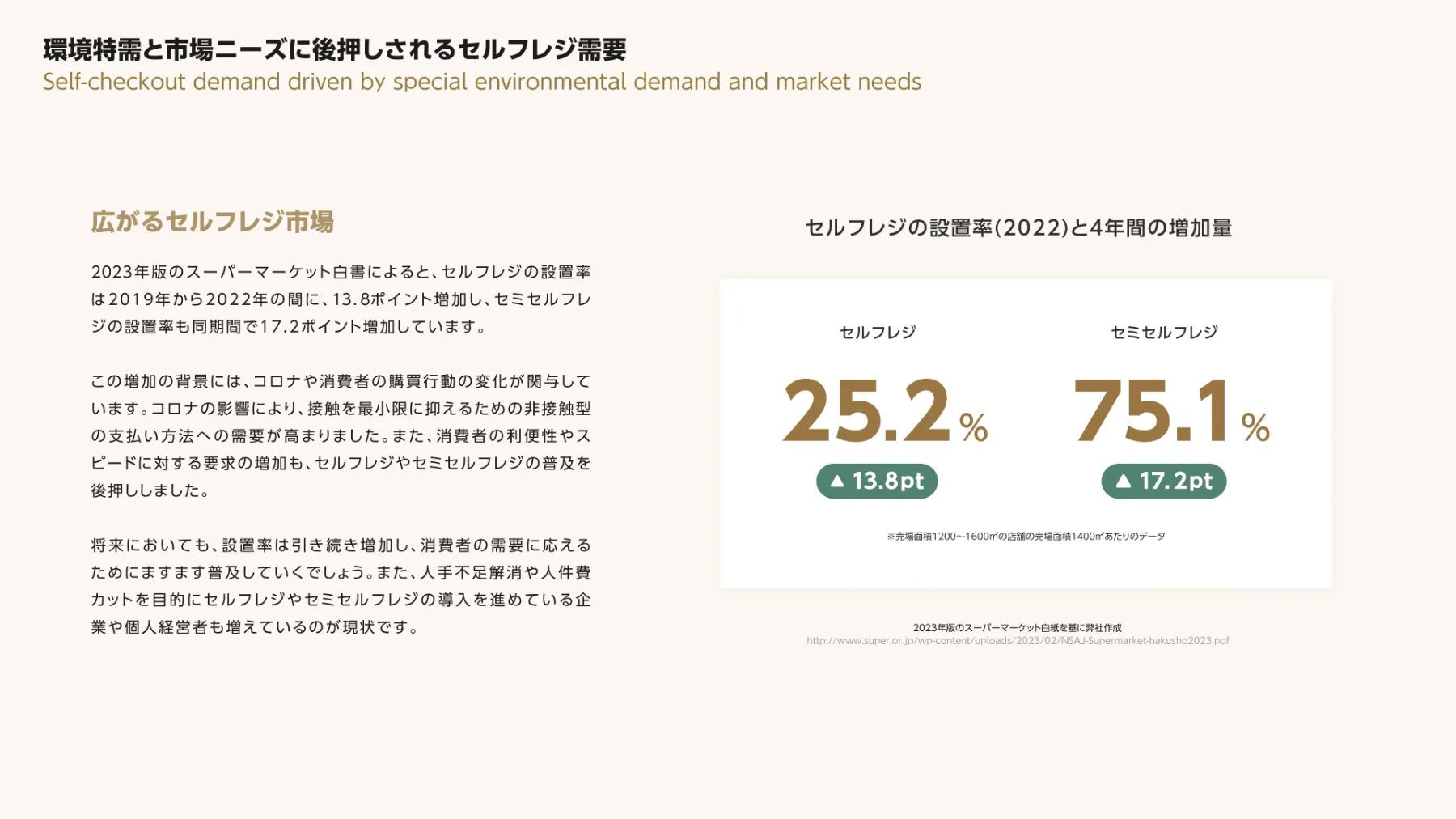 2023年版のスーパーマーケット白書によると、セルフレジの設置率は2019年から2022年の間に、13.8ポイント増加し、セミセルフレジの設置率も同期間で17.2ポイント増加しています。