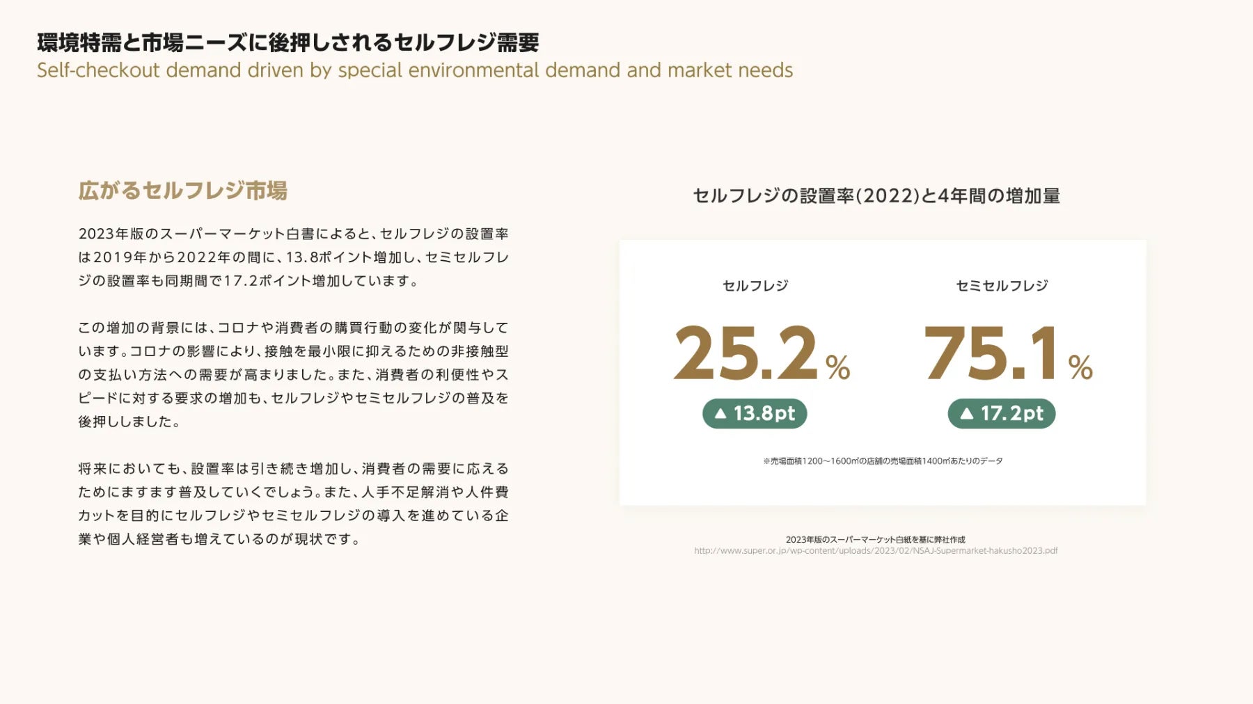 2023年版のスーパーマーケット白書によると、セルフレジの設置率は2019年から2022年の間に、13.8ポイント増加し、セミセルフレジの設置率も同期間で17.2ポイント増加しています。