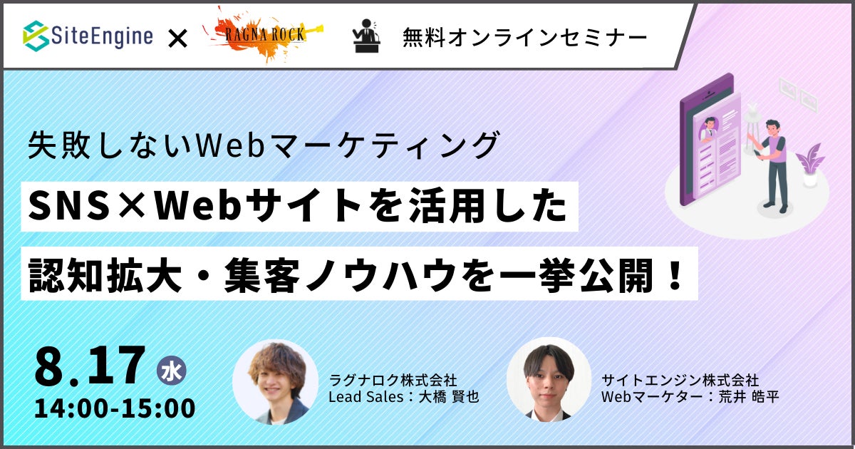 「自己表現にテクノロジーとアイデアを」を経営理念としてWebマーケティング支援サービスを提供するサイトエンジン株式会社(本社:東京都世田谷区 代表取締役:毛塚 智彦)は、2022年8月17日(水)14:00~15:00に、ラグナロク株式会社(本社:東京都渋谷区 代表取締役:西本 誠)との”【失敗しないWebマーケティング】 SNS × Webサイトを活用した認知拡大・集客ノウハウを一挙公開!” を開催します。