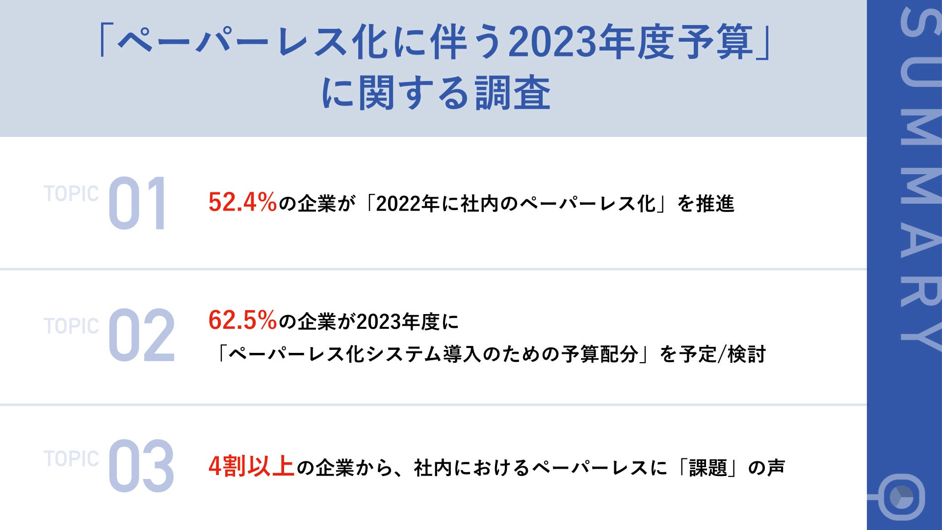 - 62.5%の企業が2023年度に「ペーパーレス化システム導入のための予算配分」を予定/検討