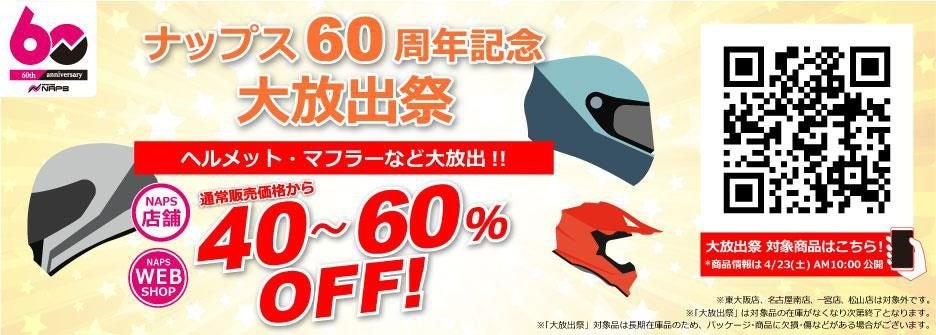 ナップス 創業60周年企画第一弾「大放出祭」、開催決定!~ マフラーやホイールなどの高額商品からヘルメットなどが40~60% OFF ~