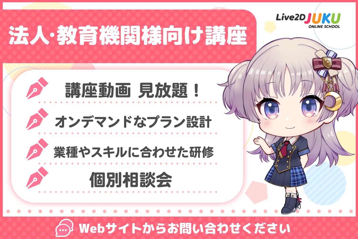 Live2D社所属の制作スタジオ Live2D Creative Studioが運営するオンライン講座『Live2D JUKU』は、企業や教育機関様向けのオンライン研修・セミナー等のサービスを実施いたします。