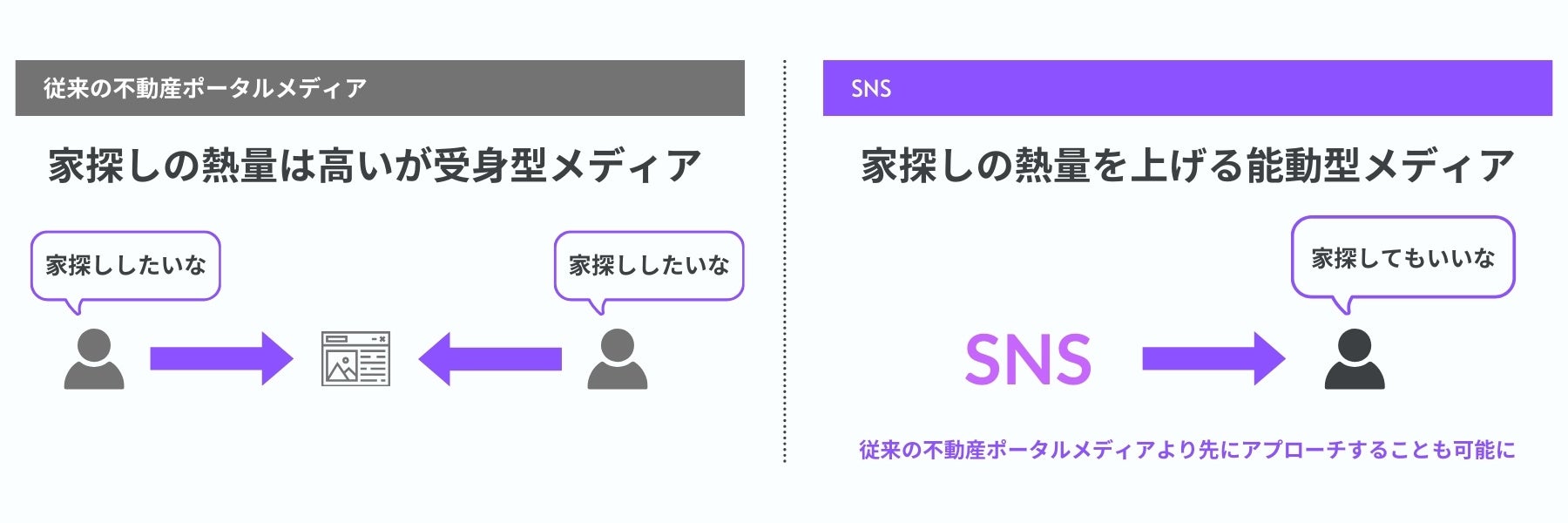 近年、家探しをする若年層ユーザーにとっての媒体が「不動産情報ポータルサイト」だけではなくなり、SNSが新たなチャネルの一つになりつつあります。また不動産会社にとってSNSは従来のポータルサイトと違い、家探しの潜在層向けにアプローチできる"能動型"のメディアとなり、これまでにない新たな層への集客チャネルになります。