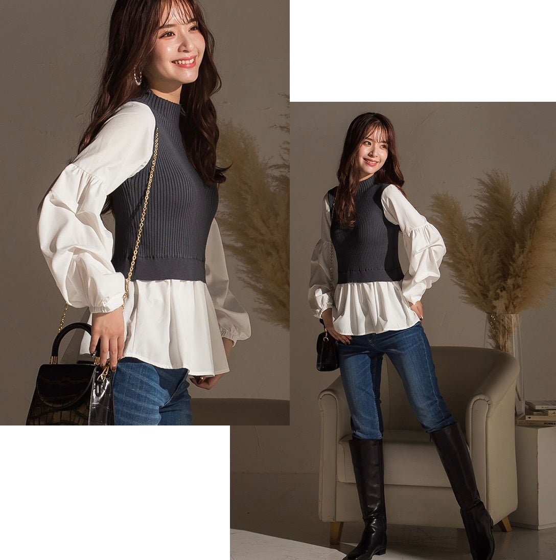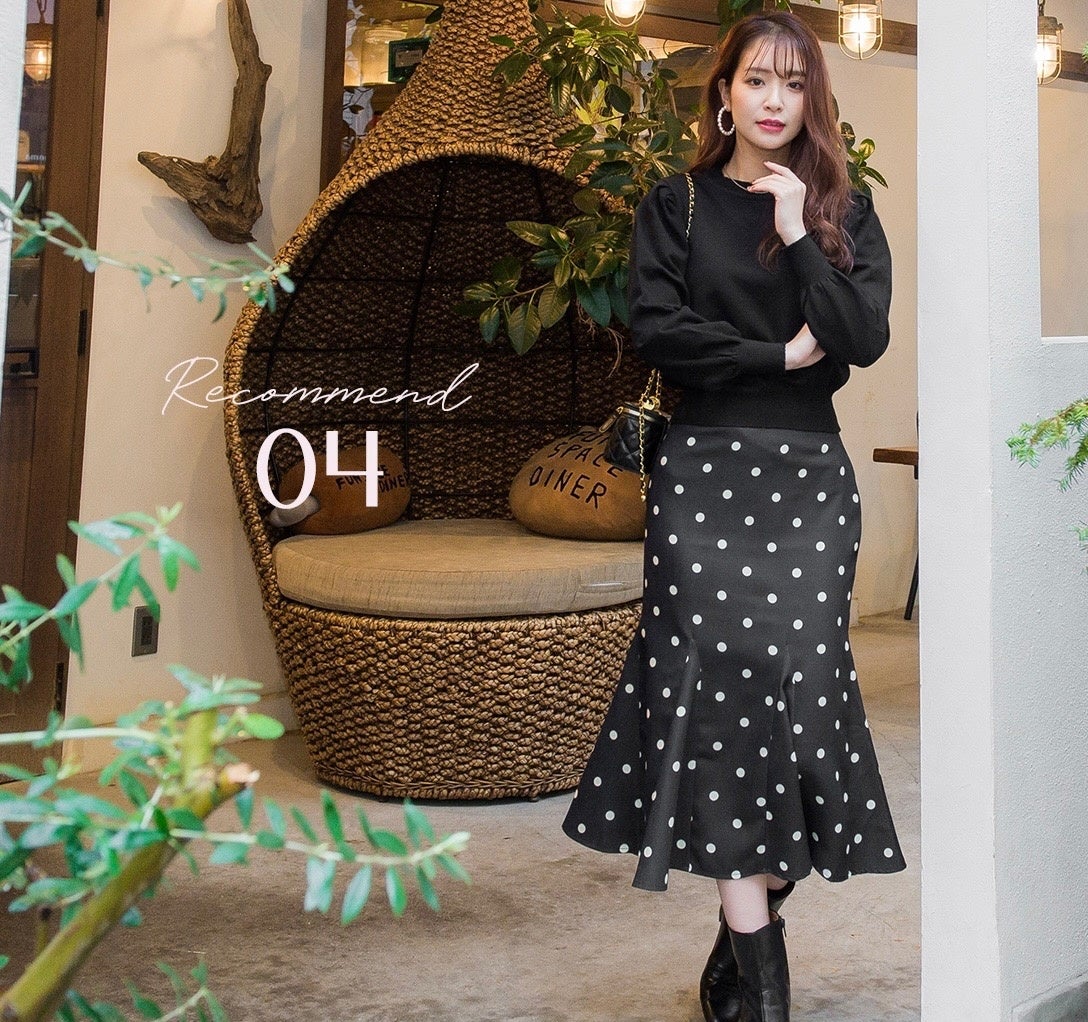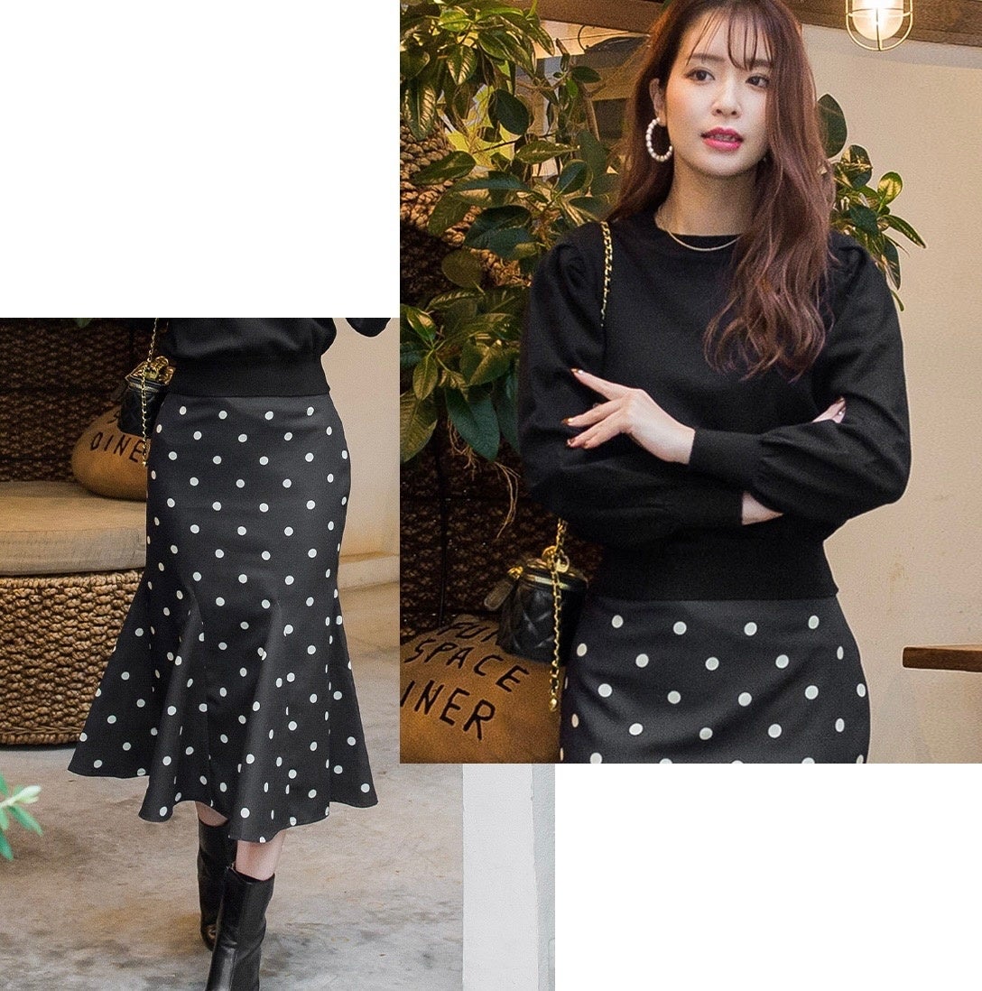 程よいサイズ感のパフスリーブニットに、ドット柄マーメイドスカートがセットになったSET UPアイテム。