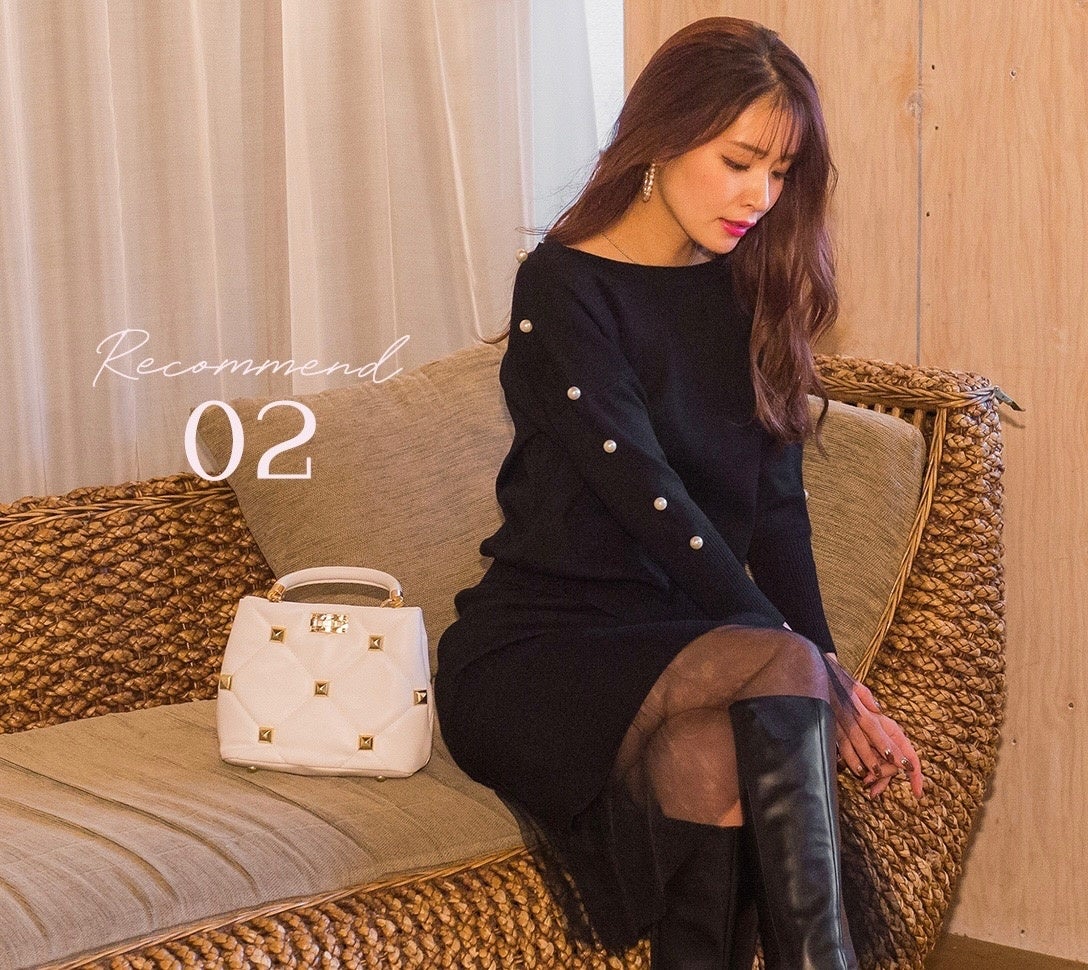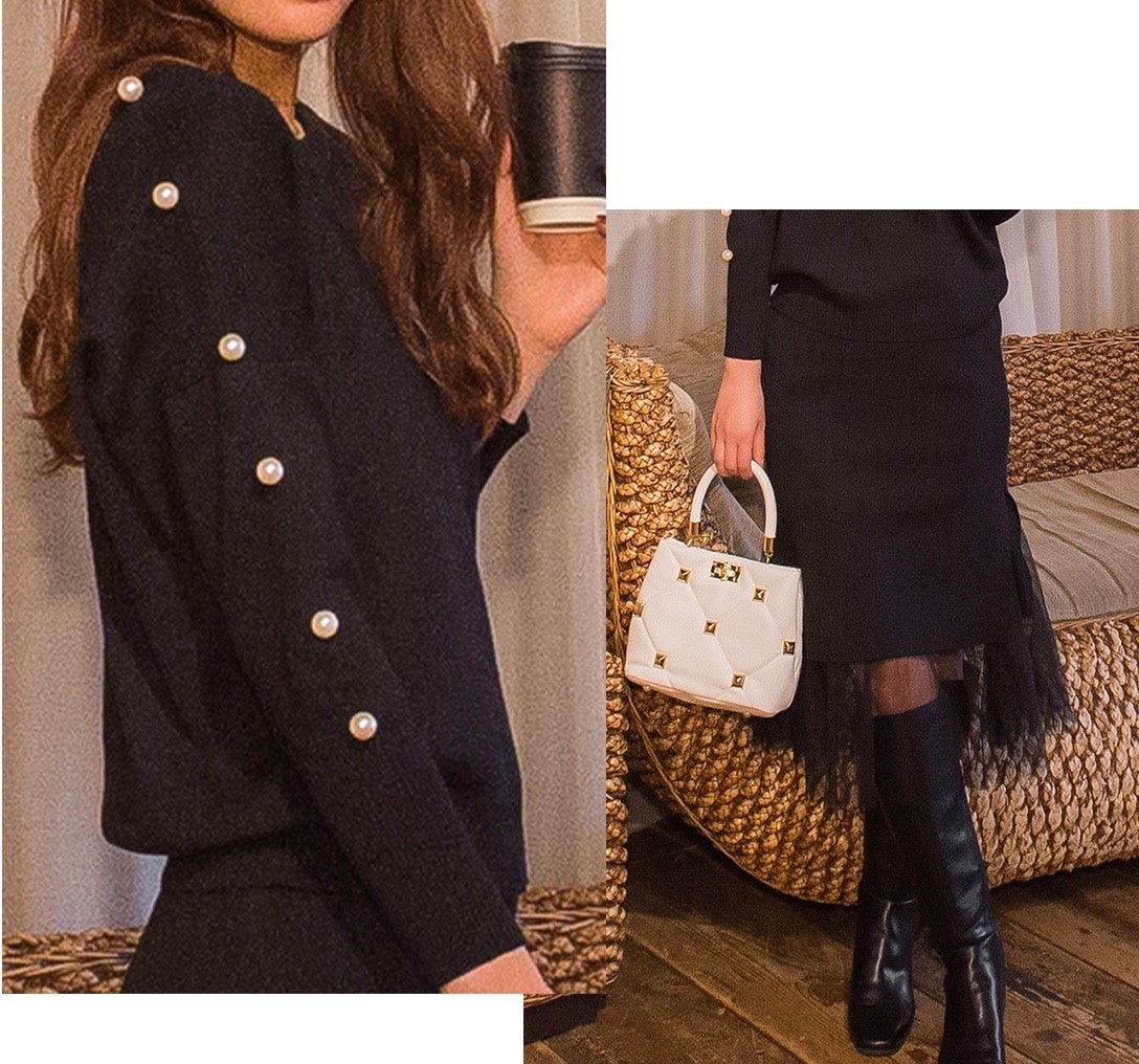 袖にパールがついたニットトップスにチュールを施したニットスカートがセットになった、ワンピース風に着られるセットアップ。